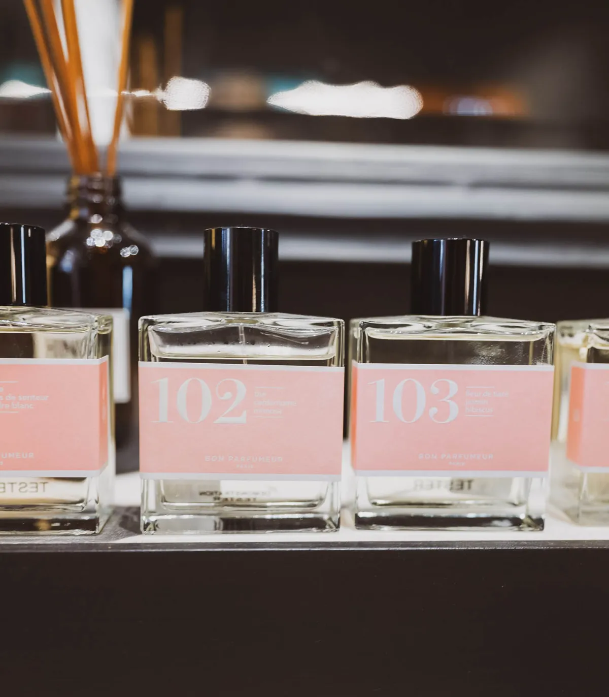 Pour renforcer la puissance des effluves de la fragrance 103 — fleur de tiaré, jasmin, hibiscus 100 ml signée Bon Parfumeur, mixez-la avec l’eau de parfum 902 — armagnac-tabac blond cannelle de la même maison.