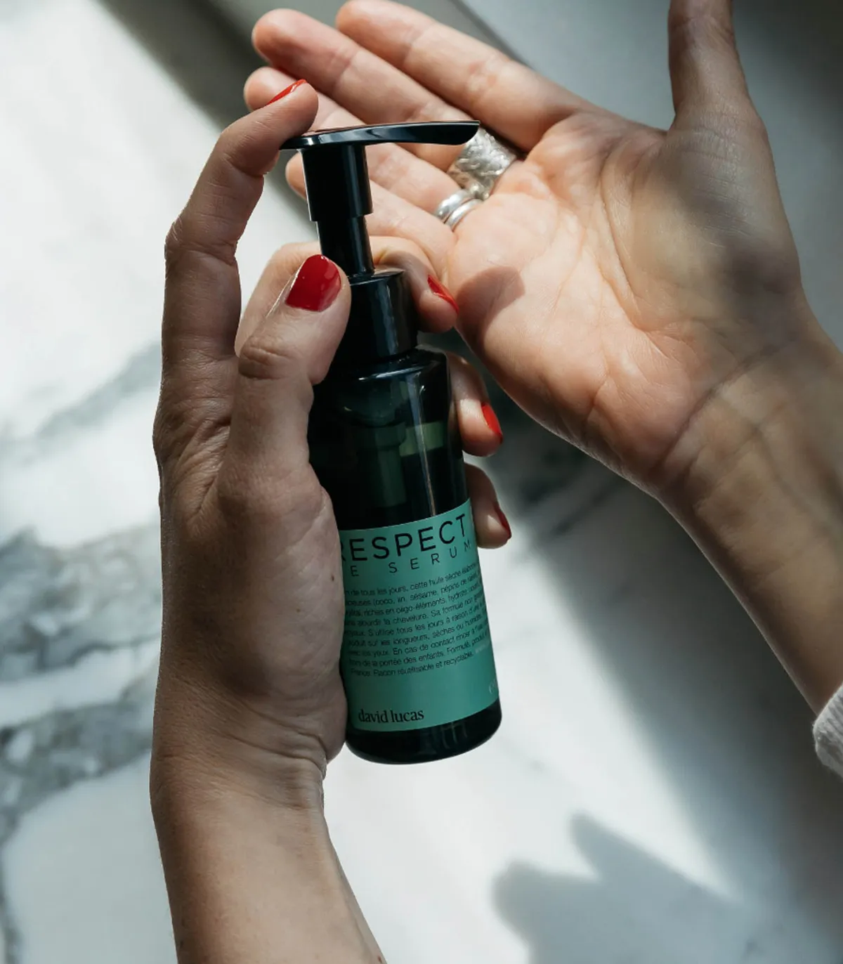 A utiliser tous les jours, le Sérum Respect pour cheveux David Lucas est une huile sèche faite à partir d’huiles précieuses. Il nourrit, hydrate et protège la fibre capillaire pour un rendu lisse et soyeux. On aime son doux parfum de basilic, et son fini brillance qui apporte de la lumière à la chevelure sans l’alourdir. Cette huile non-grasse s’utilise tous les jours, sans rinçage, et se présente dans un flacon pompe.