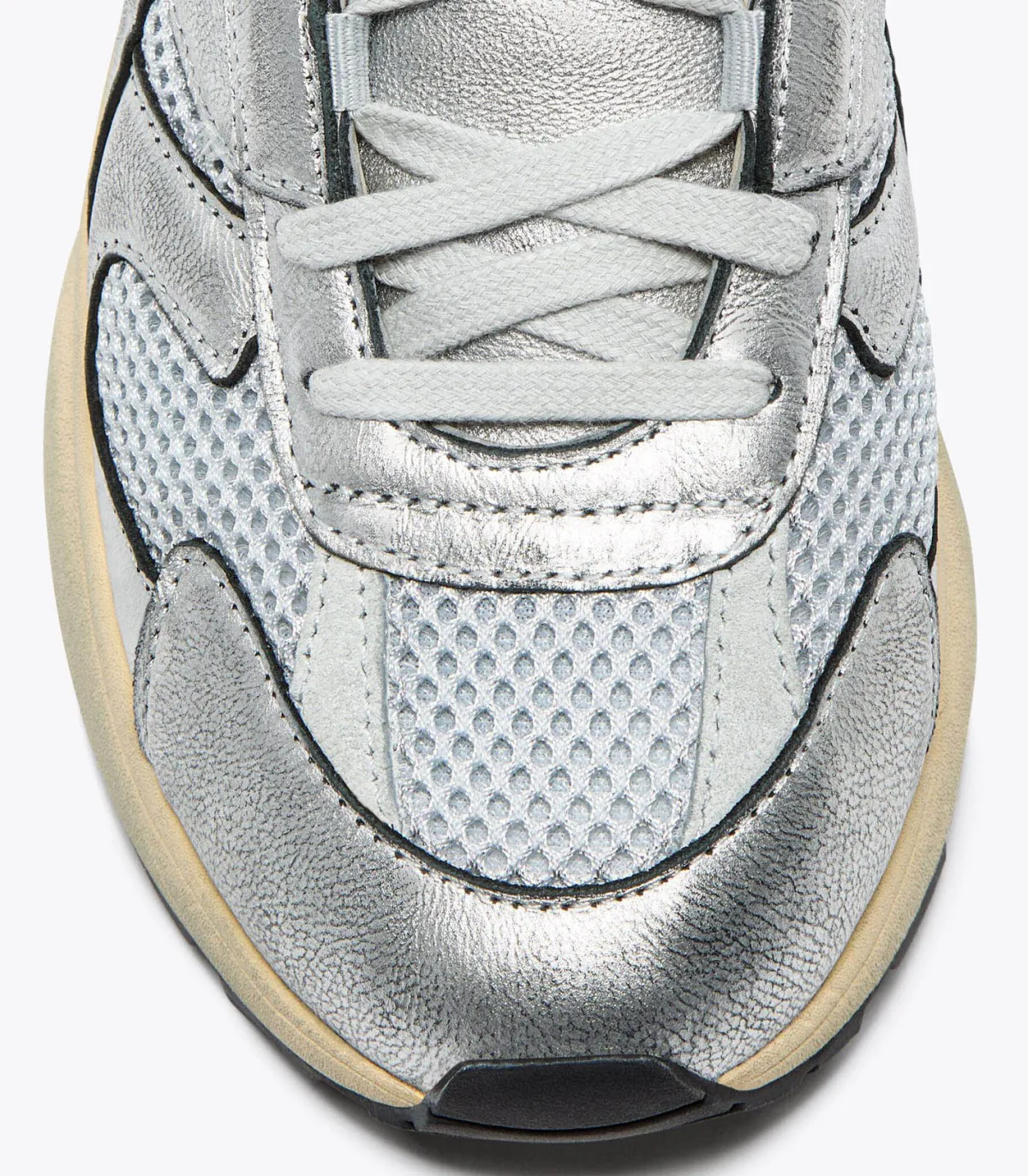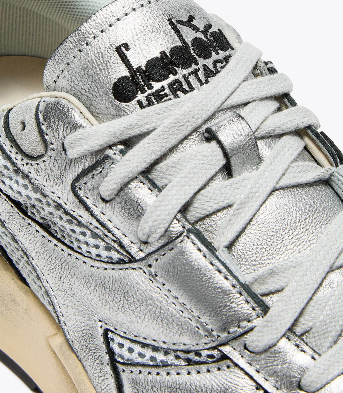 Baskets Mercury Silver Argent Métallisé de la marque Diadora. Avec son allure inspirée des chaussures de piste des années 70, la Mercury Elite Lam Used en coloris silver conjugue passé sportif et style urbain pointu. Le traitement stone wash et le cirage contrasté de la semelle renforcent son allure vintage.