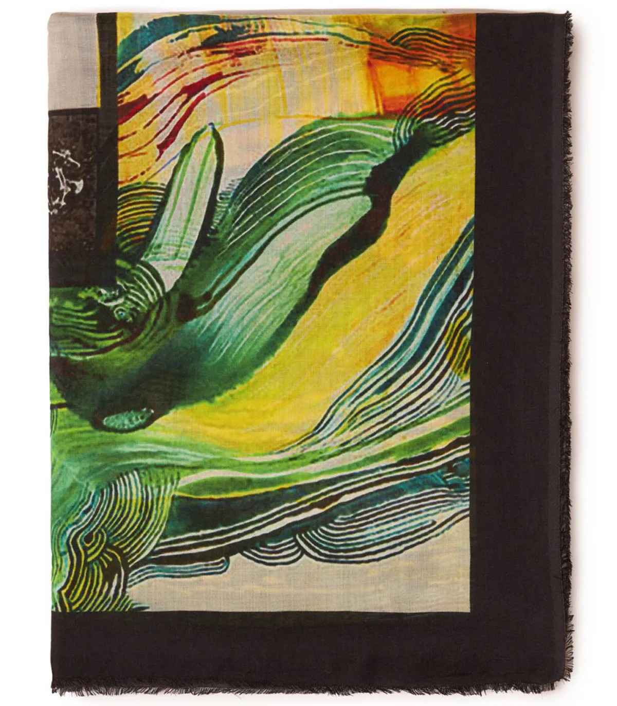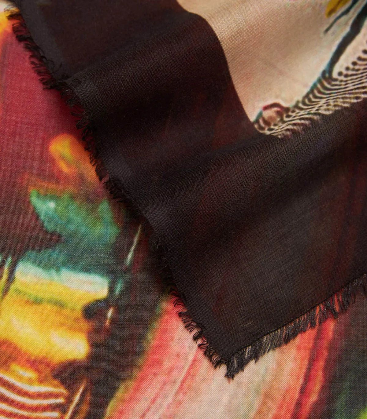 Etole Black Rhino de la marque Faliero Sarti. Peter Beard, artiste solicité pour réaliser le design de cette étole, réutilise ici le rhinocéros, élément récurrent dans ses créations. Cette photographie emblématique, prise dans le parc national d’Aberdare au Kenya, exprime l’authenticité de la nature. L’utilisation de l’aquarelle sublime le cliché. Encadré d’une bordure noire, le tissu en soie confère à l’œuvre une texture, une douceur et un confort agréables.