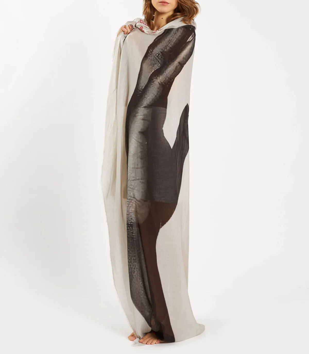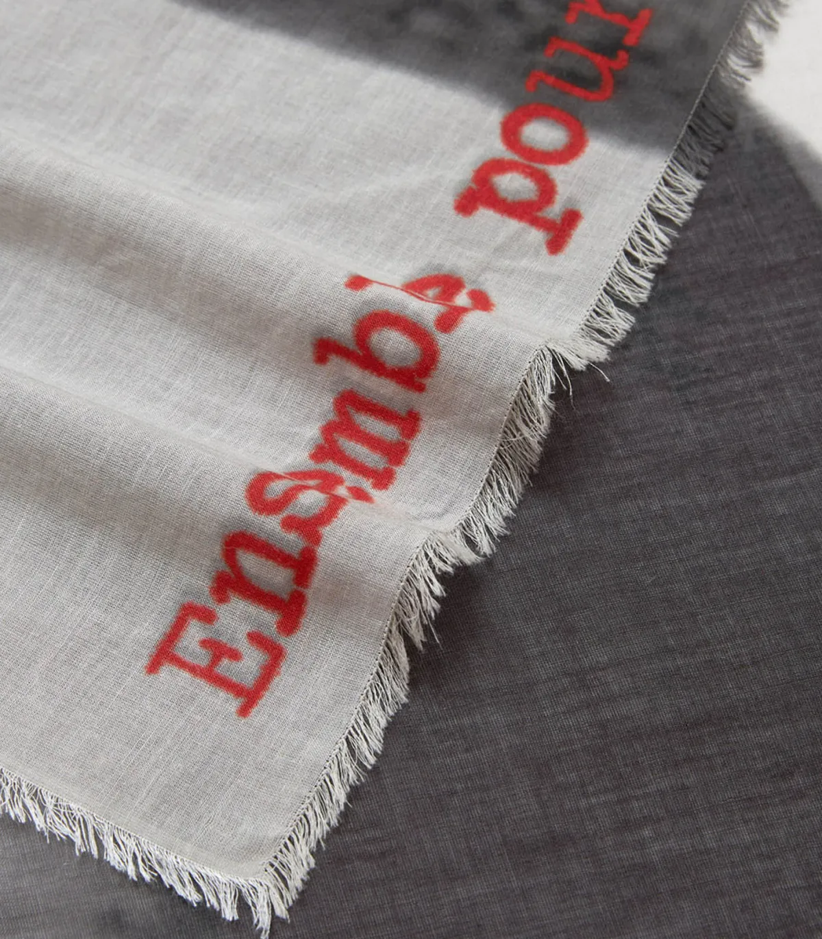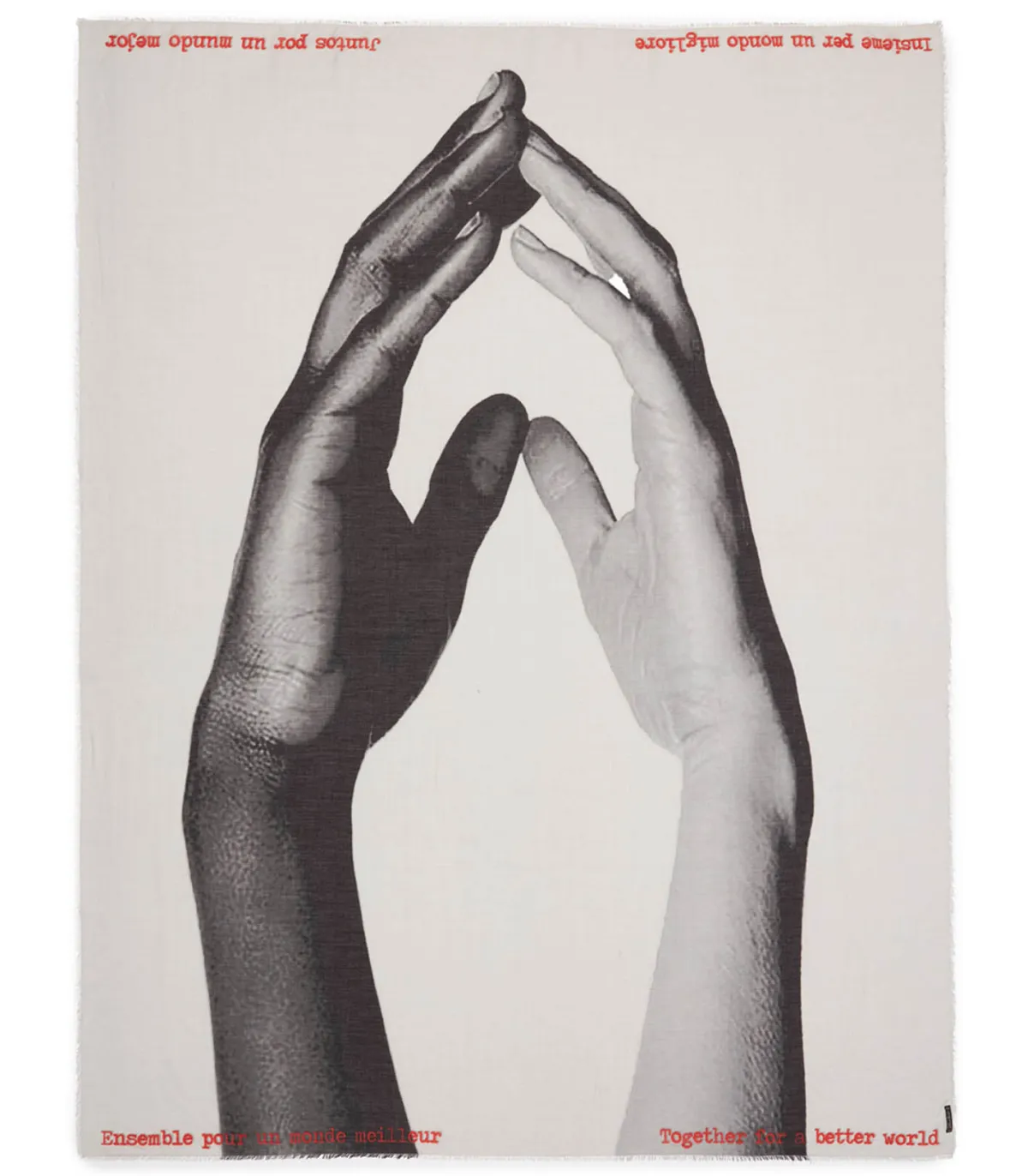Etole United de la marque Faliero Sarti. Sa base en modal et coton la rend légère et fraîche. Impression en noir & blanc de deux mains qui se touchent du bout des doigts, accompagnées des mots « ensemble pour un monde meilleur » dans diverses langues écrits en rouge dans chaque coin du foulard. Un vrai message de paix et d’unité.