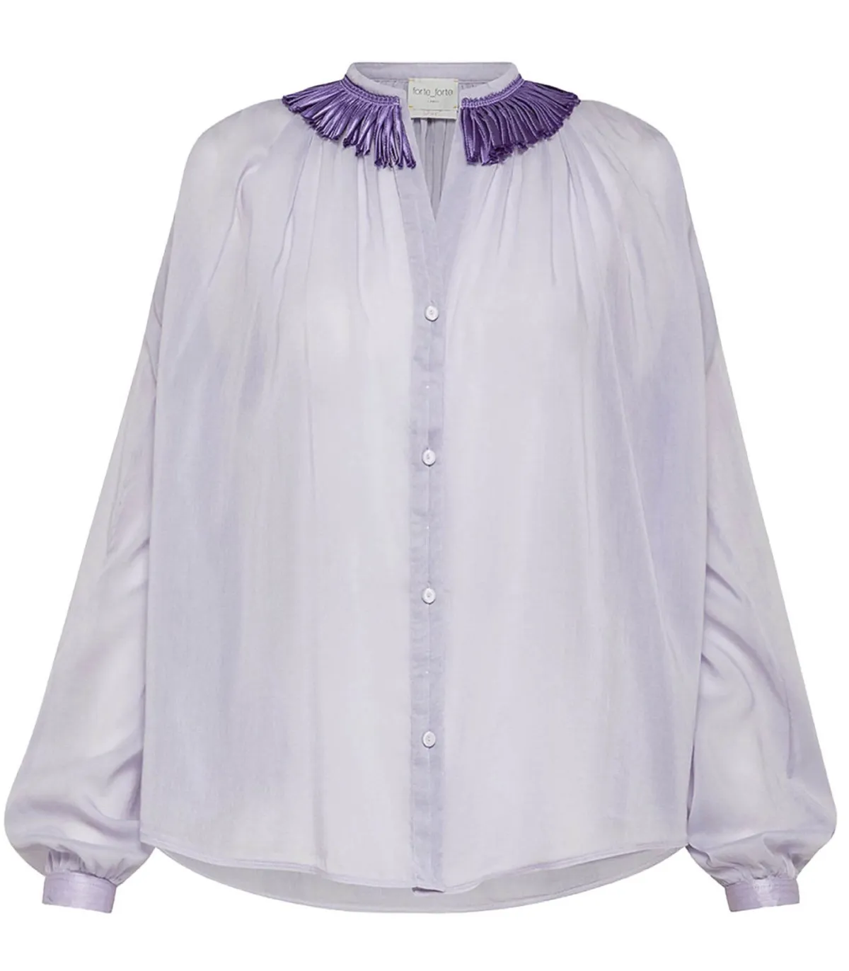 Chemise bohème couleur lilas, ultra ample et vaporeuse, s’inspirant de jardinds d’été avec son design s’apparentant à des pétals de fleur, et sa petite frange au niveau du col imitant le pistil.