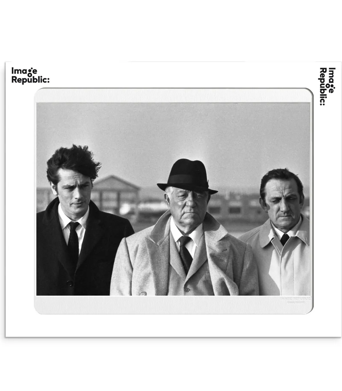 Affiche La Galerie Sicilien éditée par Image Republic au format 40 x 50 cm, un sobre tirage en noir et blanc représentant les acteurs principaux du film Le Clan des Siciliens, Alain Delon, Jean Gabin et Lino Ventura, marchant côte à côte.