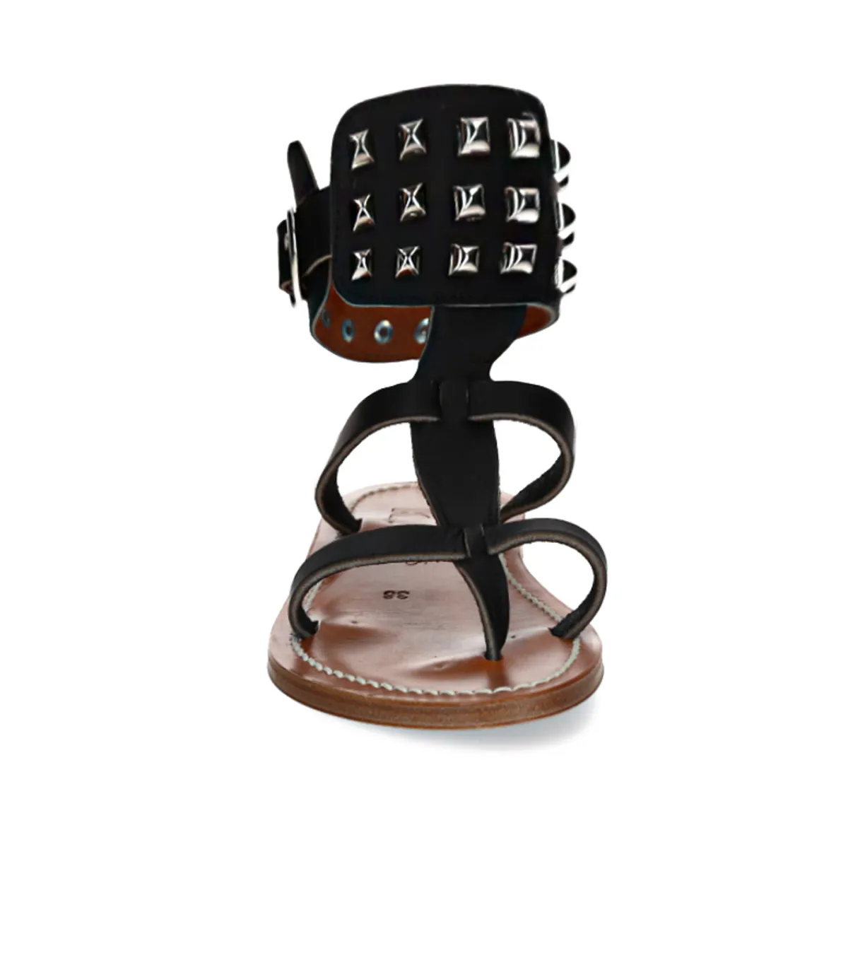 Sandales montantes Forban en cuir lisse noir et rivets métalliques argentés de la marque K.Jacques. Ce modèle résolument rock comprend un bracelet de force à la cheville et un entre-doigts. Le talon libre permet d’équilibrer les volumes tout en apportant confort et maintien.