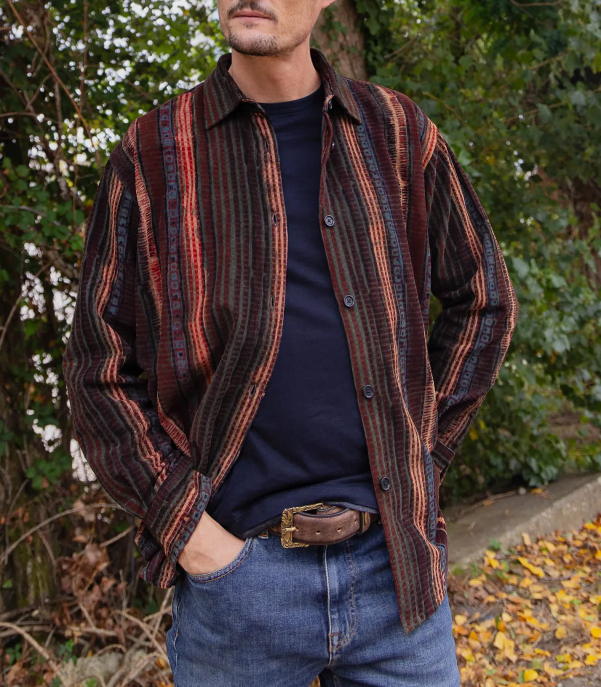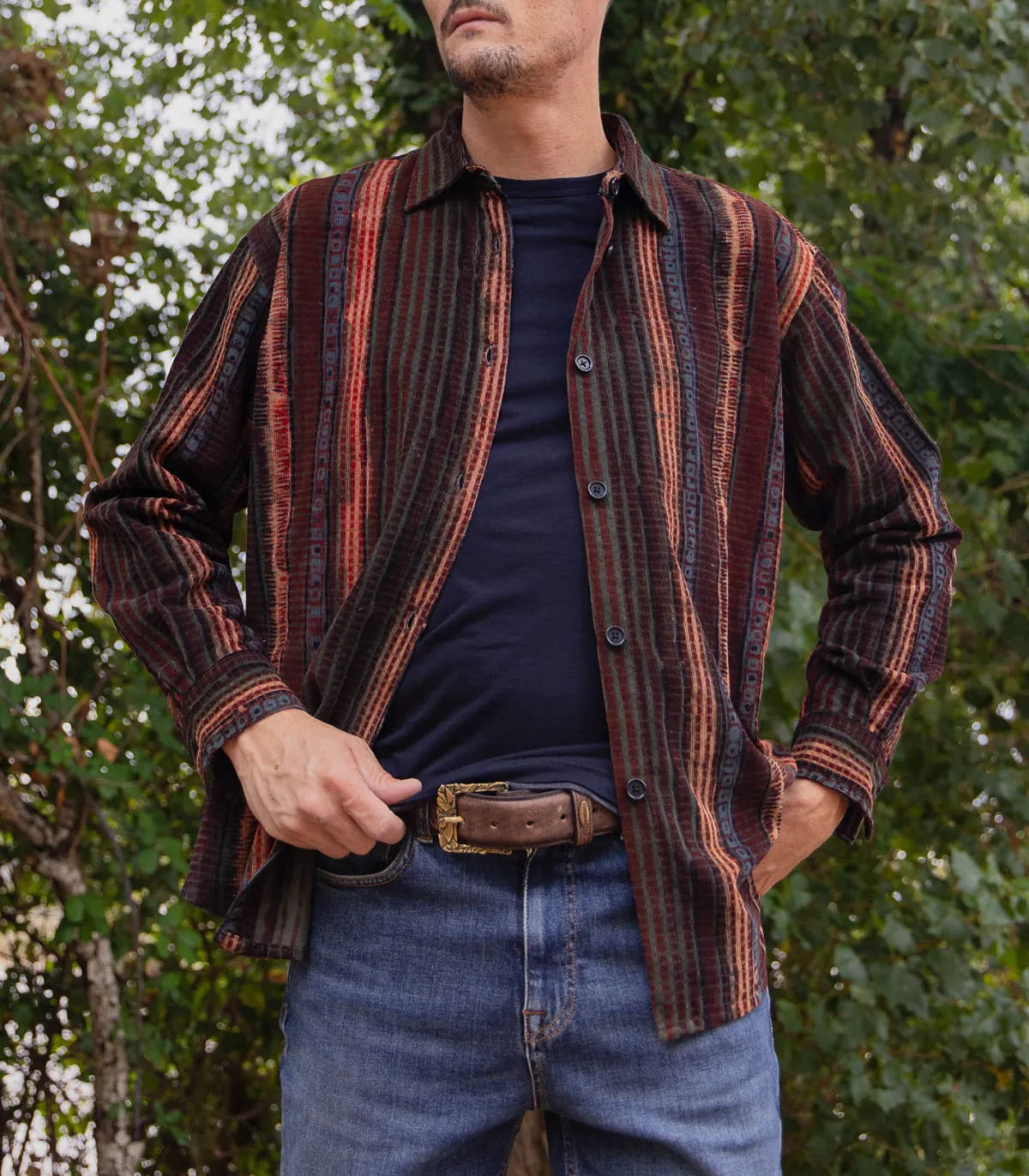 Chemise Oversize Luis de la marque Kardo. Craquez pour cette chemise marron en velours côtelé, un modèle original aux tons chaleureux qui s’adapte à toutes les occasions. Idéale avec un pantalon noir ou un jean brut, elle ajoute une touche unique à votre look. Cette chemise a été confectionnée à partir de tissus imprimés à la main, utilisant une technique traditionnelle d’impression au bloc.