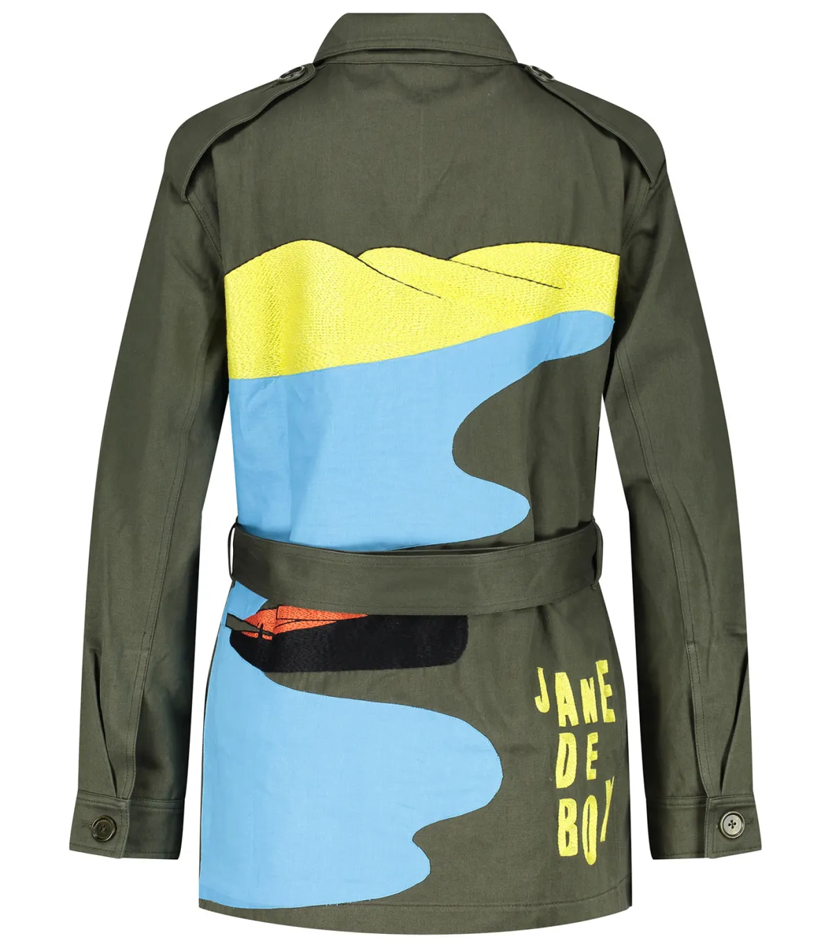 - Au dos, broderie « Jane de Boy » et barque rouge au bord du Bassin en tissu appliqué