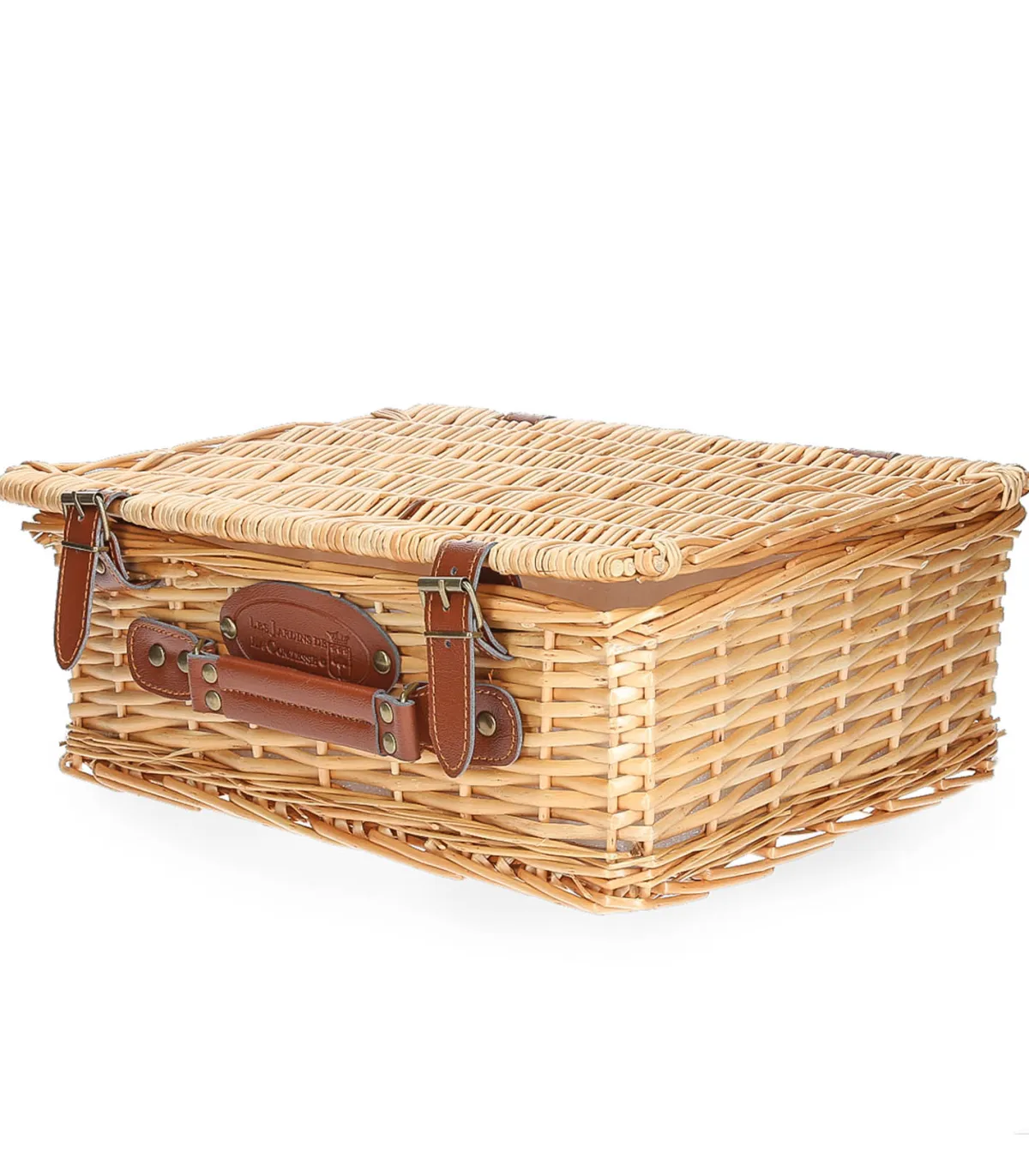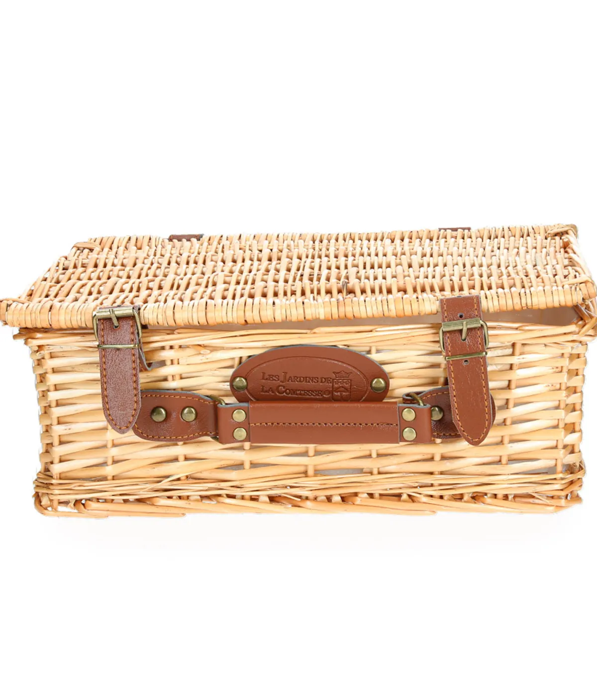 Valisette de Pique-Nique Carreaux Lin de la marque Les Jardins de la Comtesse, parfaite pour emporter vos ustensiles et vaisselle pour un repas en plein air. Elle peut également servir de petit bagage pour partir en week-end. Grâce à sa structure en osier résistant, elle permet de protéger tout ce que vous souhaitez transporter. Poignée en cuir résistante sur le dessus et fermeture par sangles ceinture.