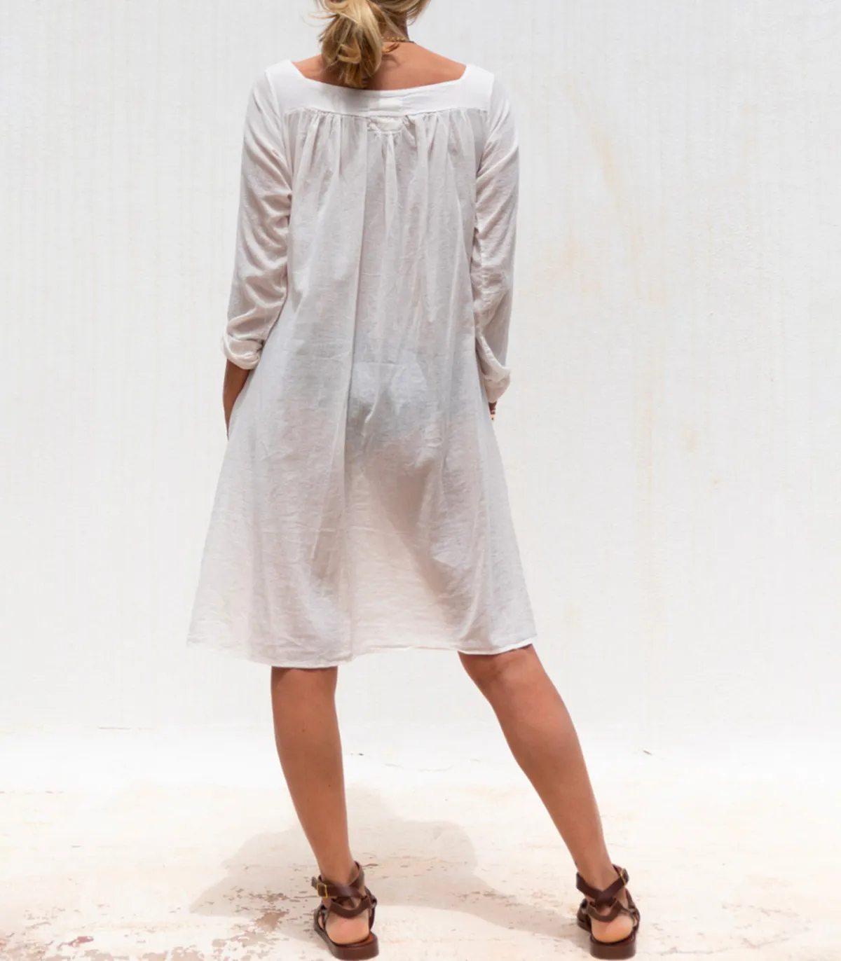 Légère et féminine, la robe Salt Lake est conçue en gaze de coton simple dans un coloris Off White qui vient renforcer son côté aérien. Son décolleté carré affirme son allure féminine et ses poches latérales son côté pratique.