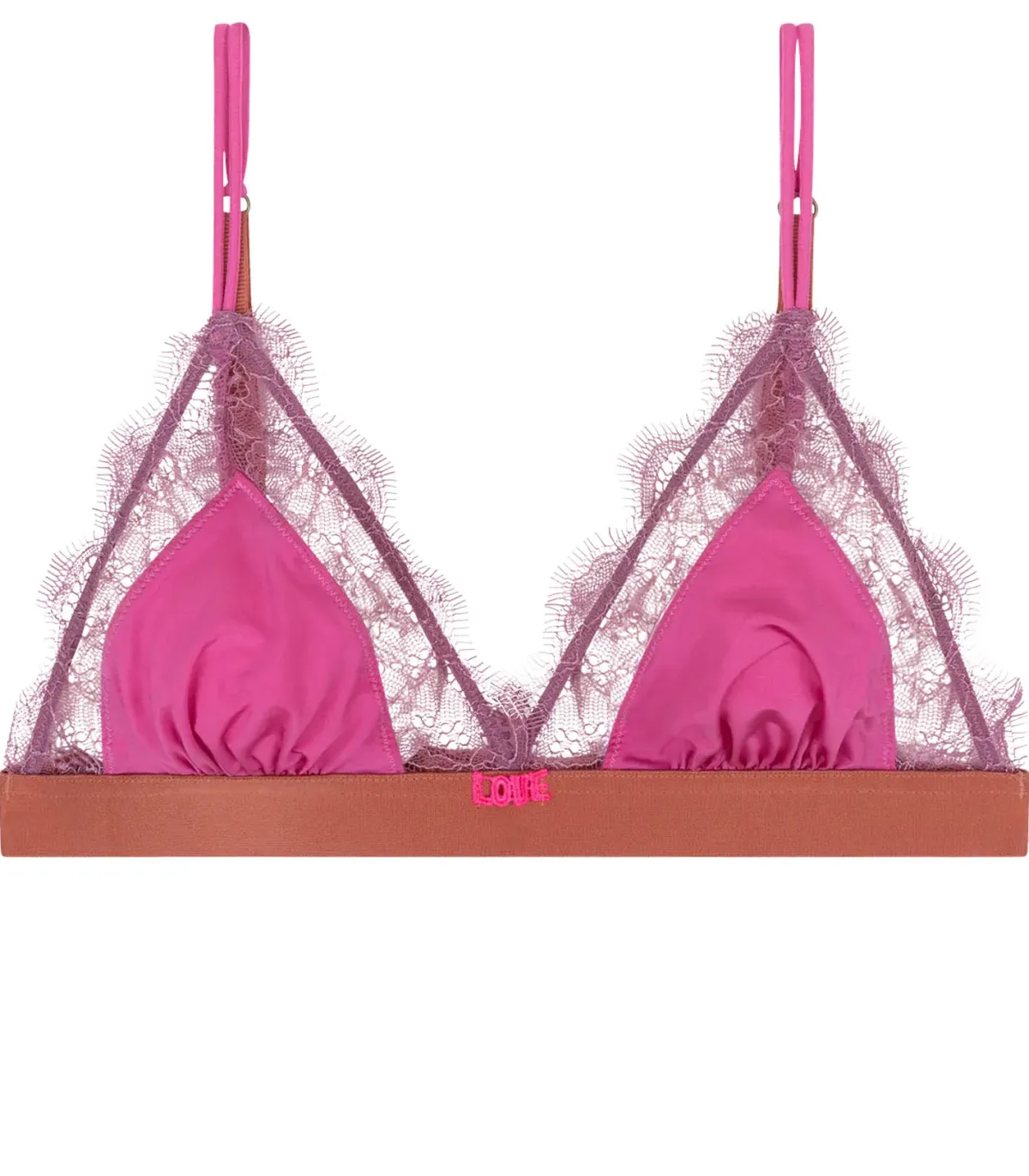 Soutien-gorge Love Lace Pink de la marque Love Stories. Laissez-vous séduire par cette bralette triangle, déclinée dans un rose lumineux. Confectionnée dans un tissu doux et subtilement brillant, elle épouse délicatement la peau pour un confort incomparable.