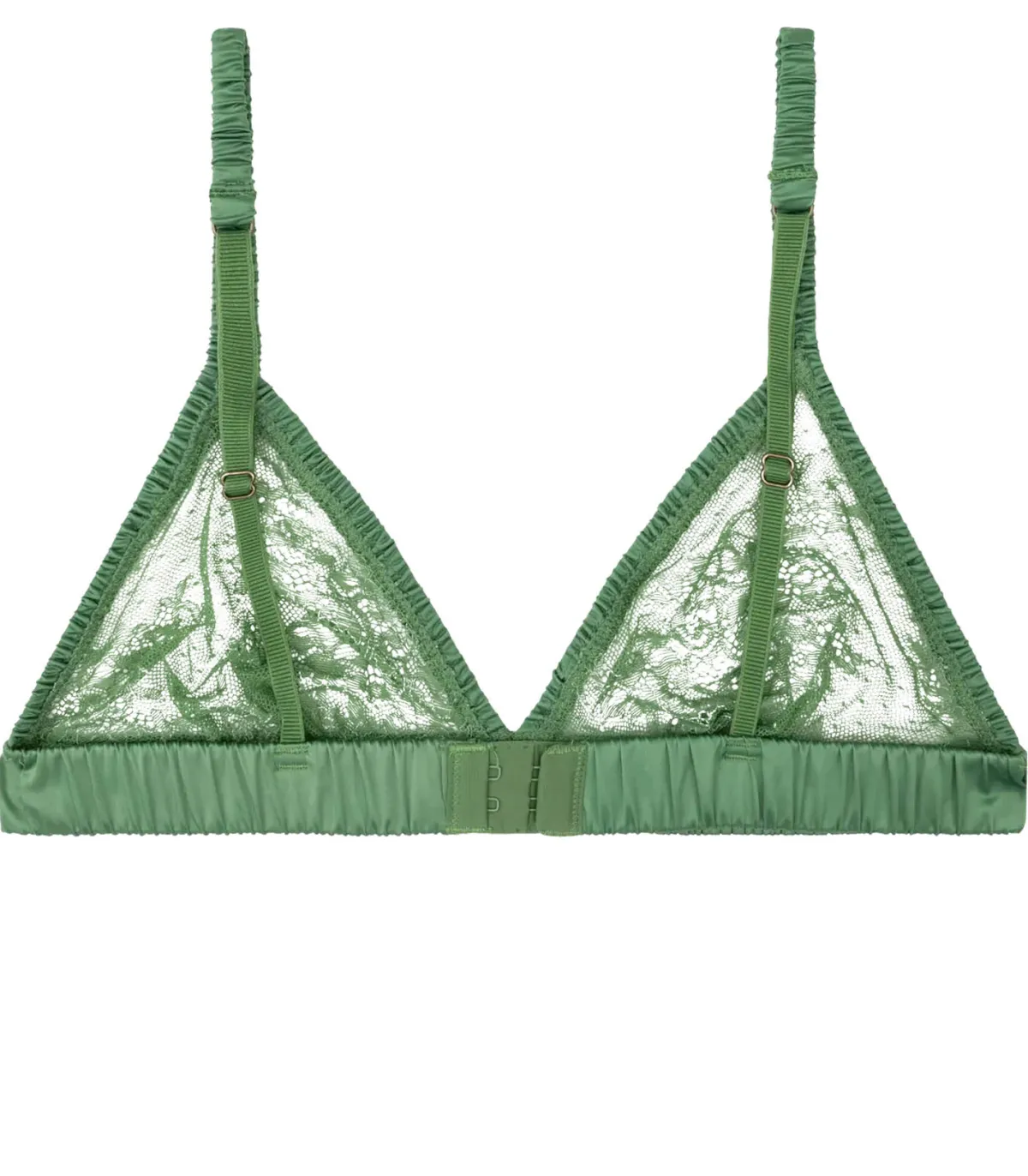 Soutien-gorge Uma Vert de la marque Love Stories. La bralette triangle Uma séduit par sa délicate dentelle et sa teinte vert forêt intense. Non rembourrée, elle assure un maintien moyen tout en sublimant la silhouette avec légèreté.