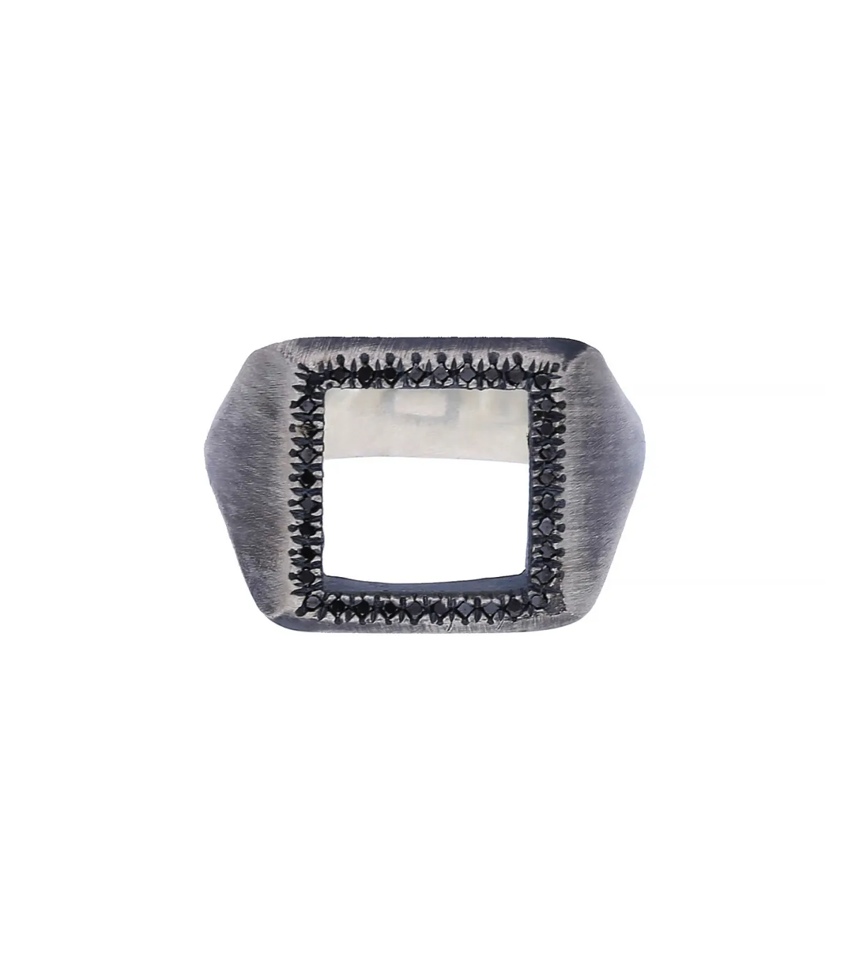 The Zenith Diamond Ring est une bague alliant matériaux raffinés et look brut, dessinée par M.Cohen. L’argent 925 à effet oxydé est une signature du créateur californien. Cette bague unisexe se distingue par l’incrustation de diamants noirs et par sa forme carrée laissant apparaître la peau.