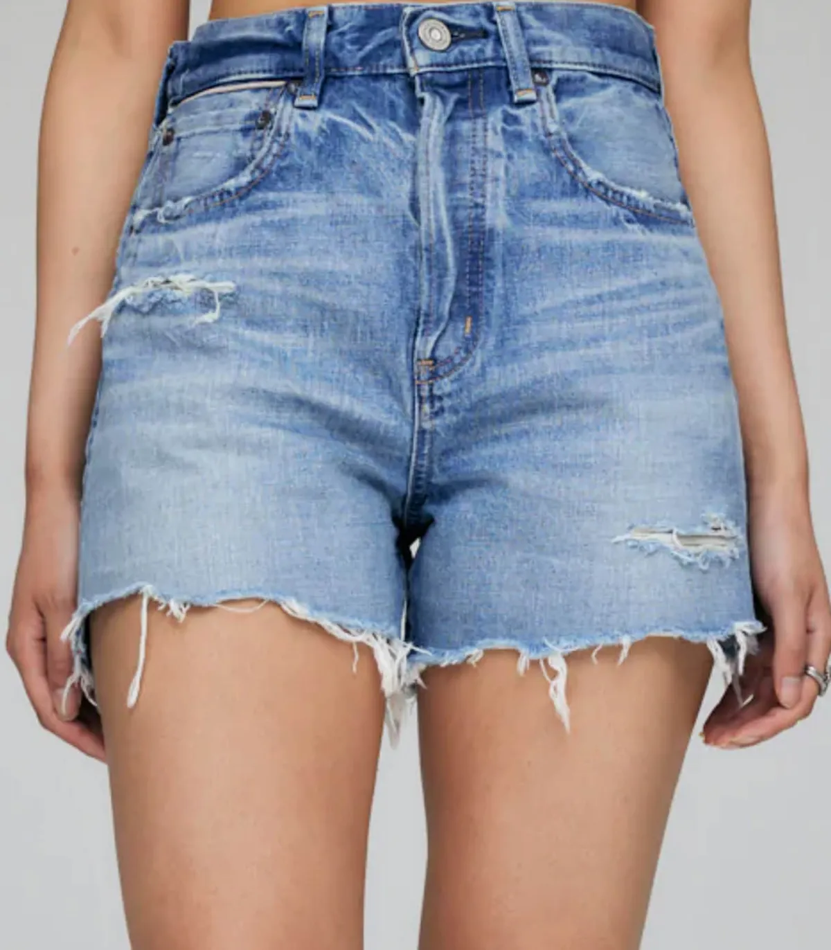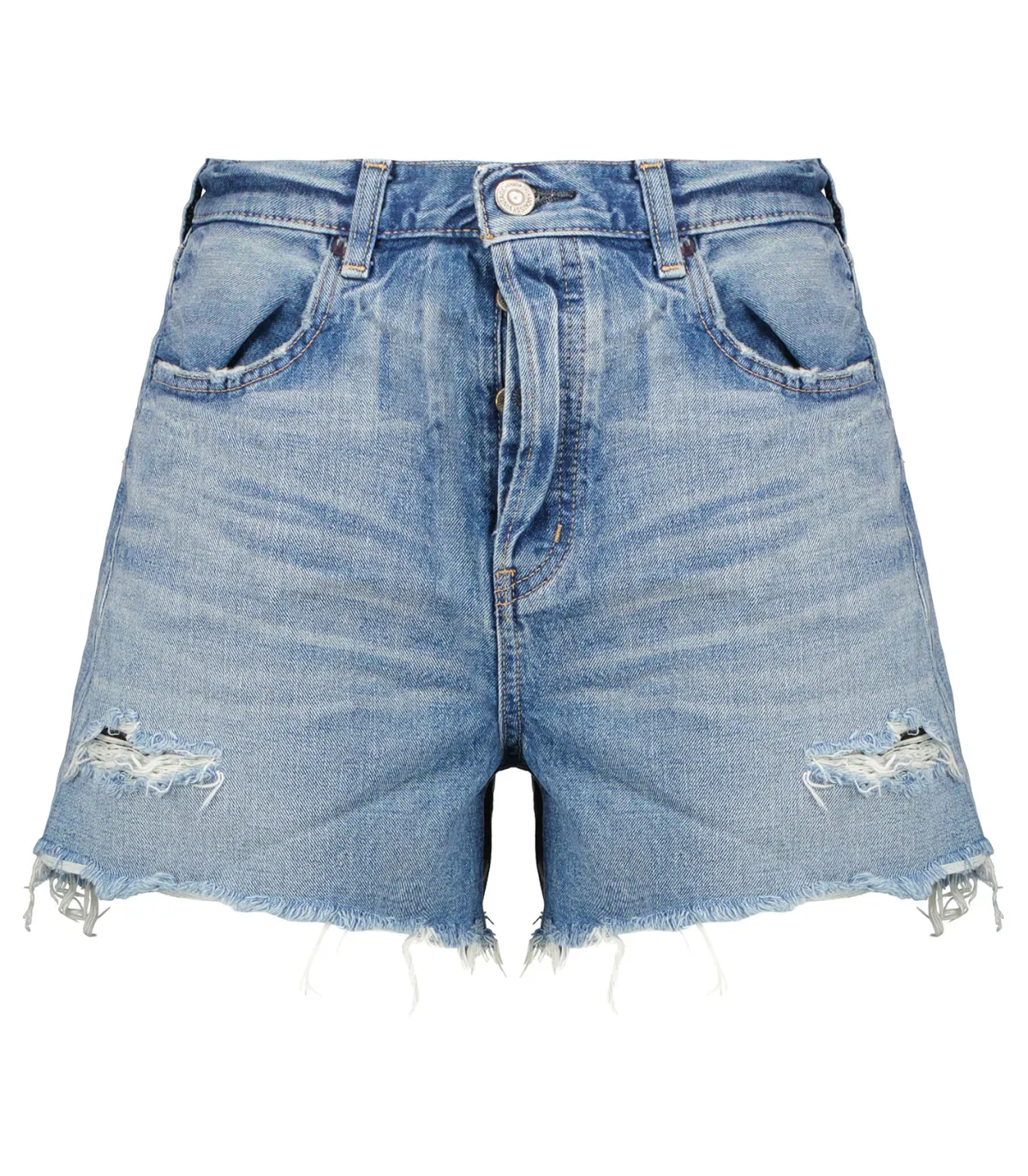 Coup de coeur pour le short en denim Pelion à taille haute Moussy Vintage, la quintessence du short en jean à coupe rétro qui flatte la silhouette avec sa taille haute, destroy à souhait avec son délavage soutenu et ses bords effilochés.