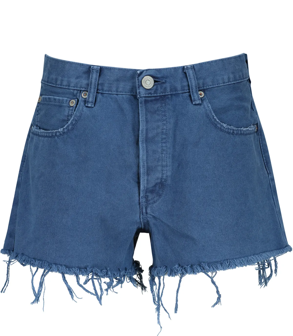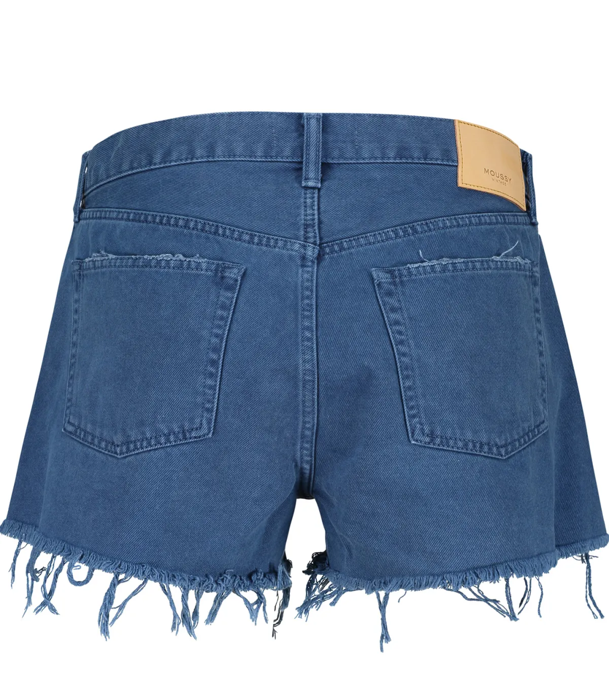 Short en jean Moussy Vintage de couleur bleu indigo et à bords francs.