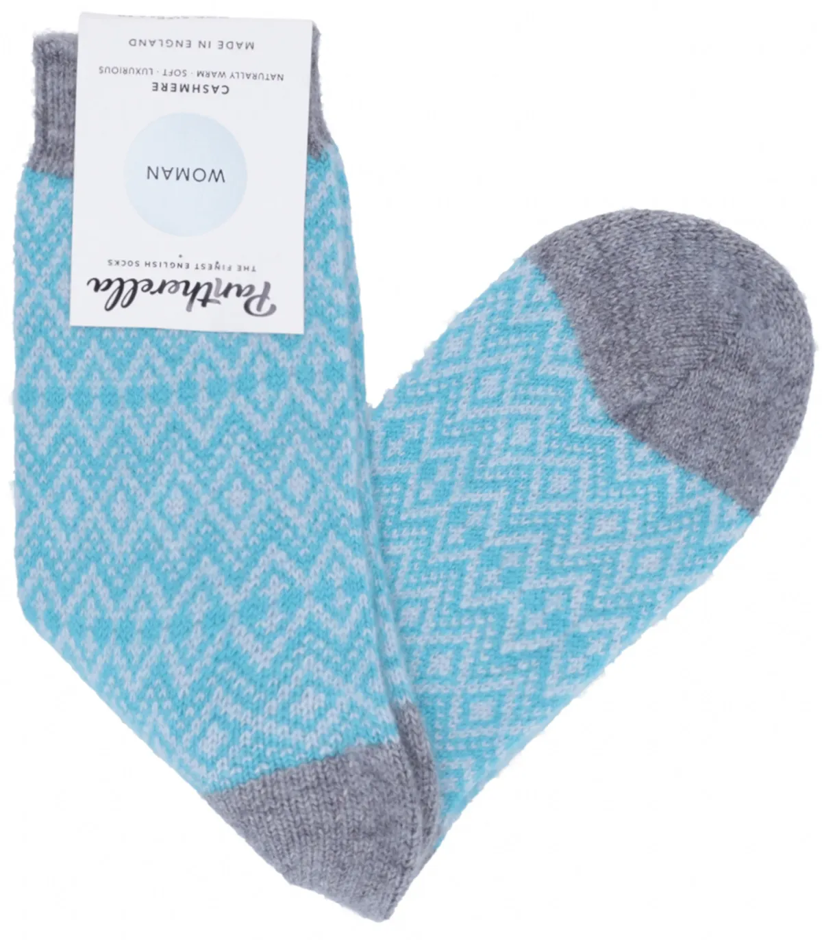 Chaussettes pour femme Aster de la marque Pantherella, en cachemire à motifs chevrons sur une base colorée. Les extrémités aux orteils et aux talons sont dans des coloris contrastants.