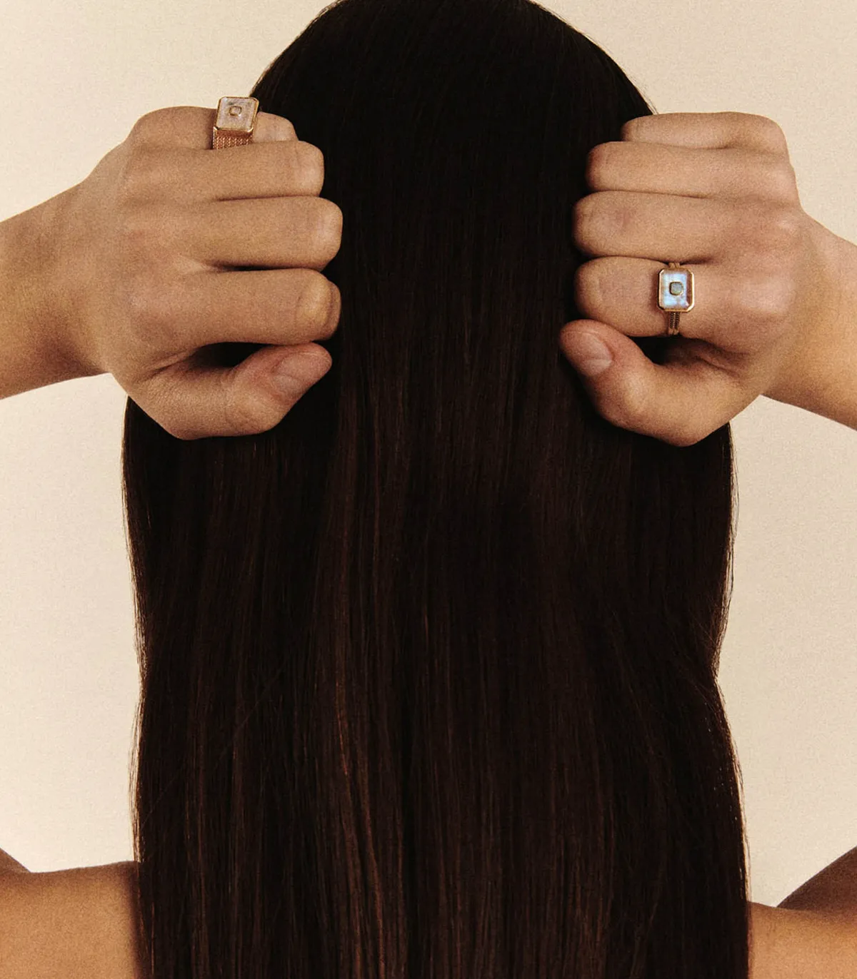 La chevalière, pièce phare, associe une pierre de lune translucide aux reflets mystérieux et une opale iridescente subtilement incrustée. Une signature intemporelle pour affirmer sa singularité.