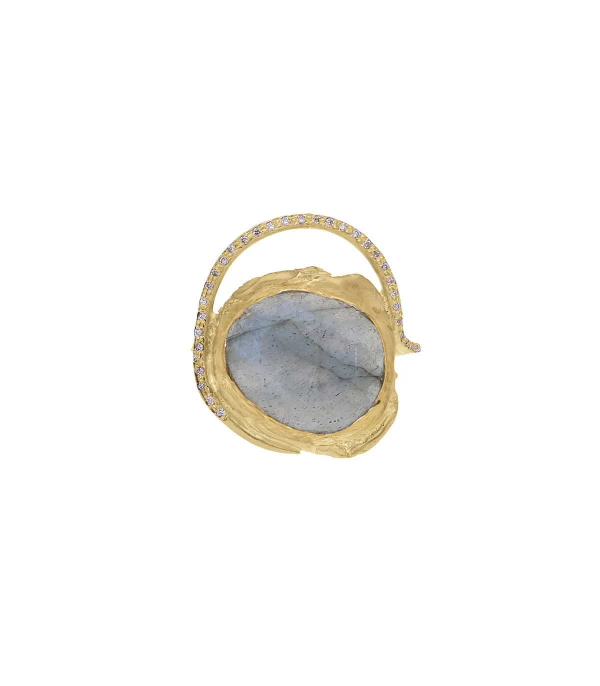 Bague Gaia de chez Pascale Monvoisin, en or jaune martelé, avec une pierre labradorite facettée, sertie de 31 diamants.