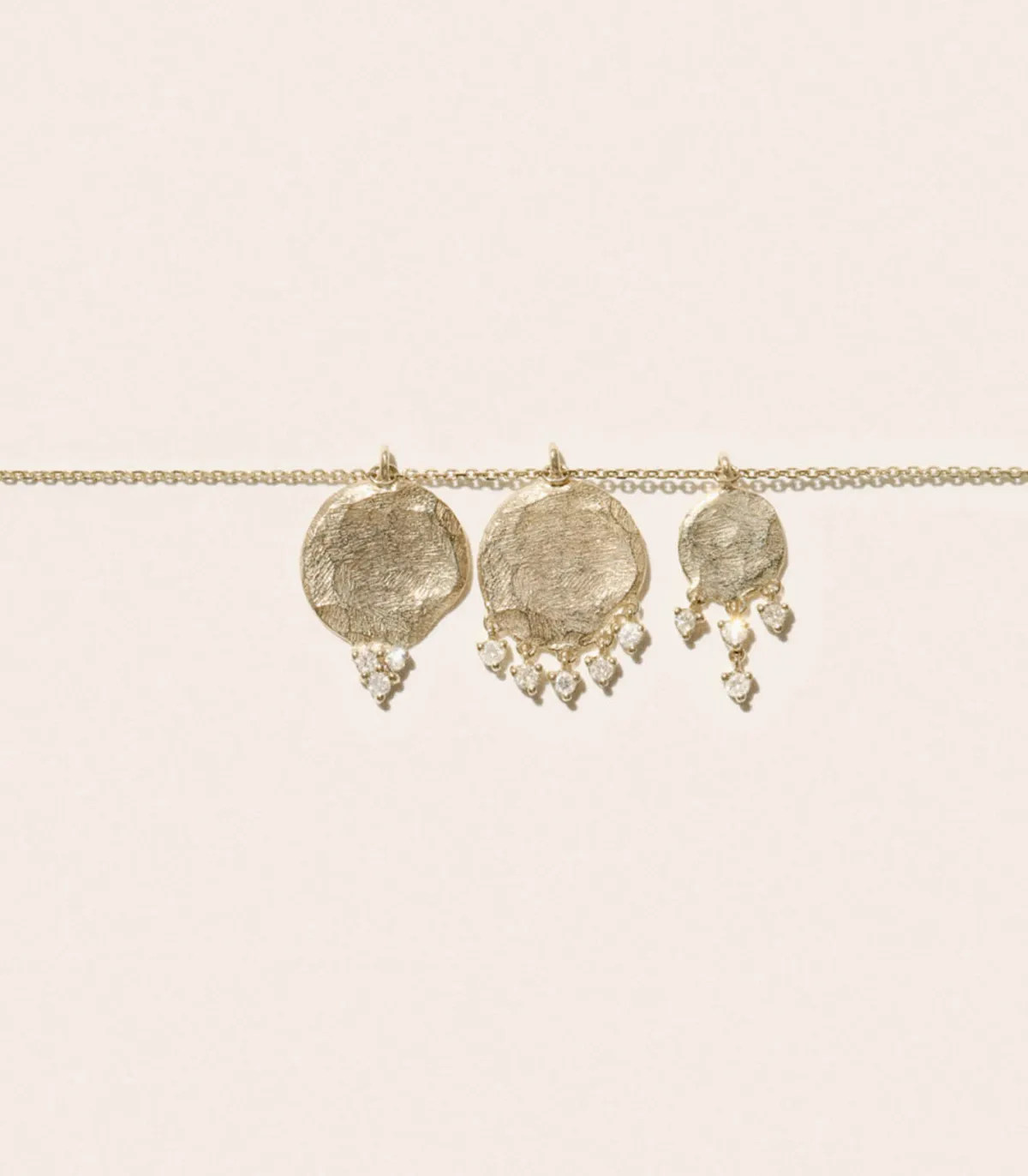 Collier Gaby n°3 signée Pascale Monvoisin. Cette collection sublime l’or texturé, évoquant l’apparence délicate de la feuille d’or. L’or capte la lumière à chaque mouvement, tandis que les cascades de diamants s’entrelacent et se répondent, créant un jeu d’éclat et de fluidité.