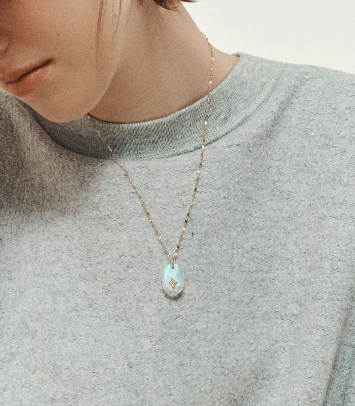 Le collier GAIA N°1 incarne l’élégance bohème chère à Pascale Monvoisin. Son pendentif organique mêle la douceur laiteuse de la pierre de lune à l’éclat discret d’un diamant, créant un contraste délicat et poétique. Suspendu à une fine chaîne en or jaune, il évoque un bijou ancien, à la fois précieux et facile à vivre. Un talisman moderne au charme brut et raffiné, pensé pour celles qui aiment les bijoux singuliers, porteurs d’âme.