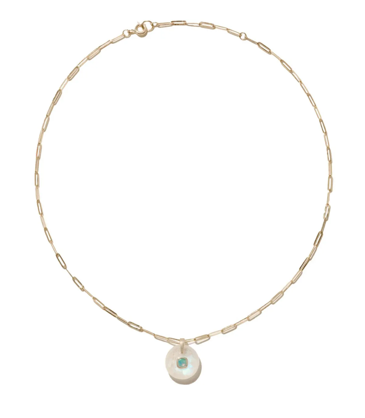 Collier Milo Moonstone signé Pascale Monvoisin. Ces deux nouveaux colliers s’inscrivent dans la lignée emblématique des pierres incrustées Orso. Entre rondeur des formes et éclat minéral, ils réunissent la douceur laiteuse de la pierre de lune, la fraîcheur vibrante de la turquoise et les reflets irisés de l’opale. Un trio précieux suspendu au creux du cou, sur une fine chaîne en or 9 carats, pour une allure lumineuse et résolument bohème.