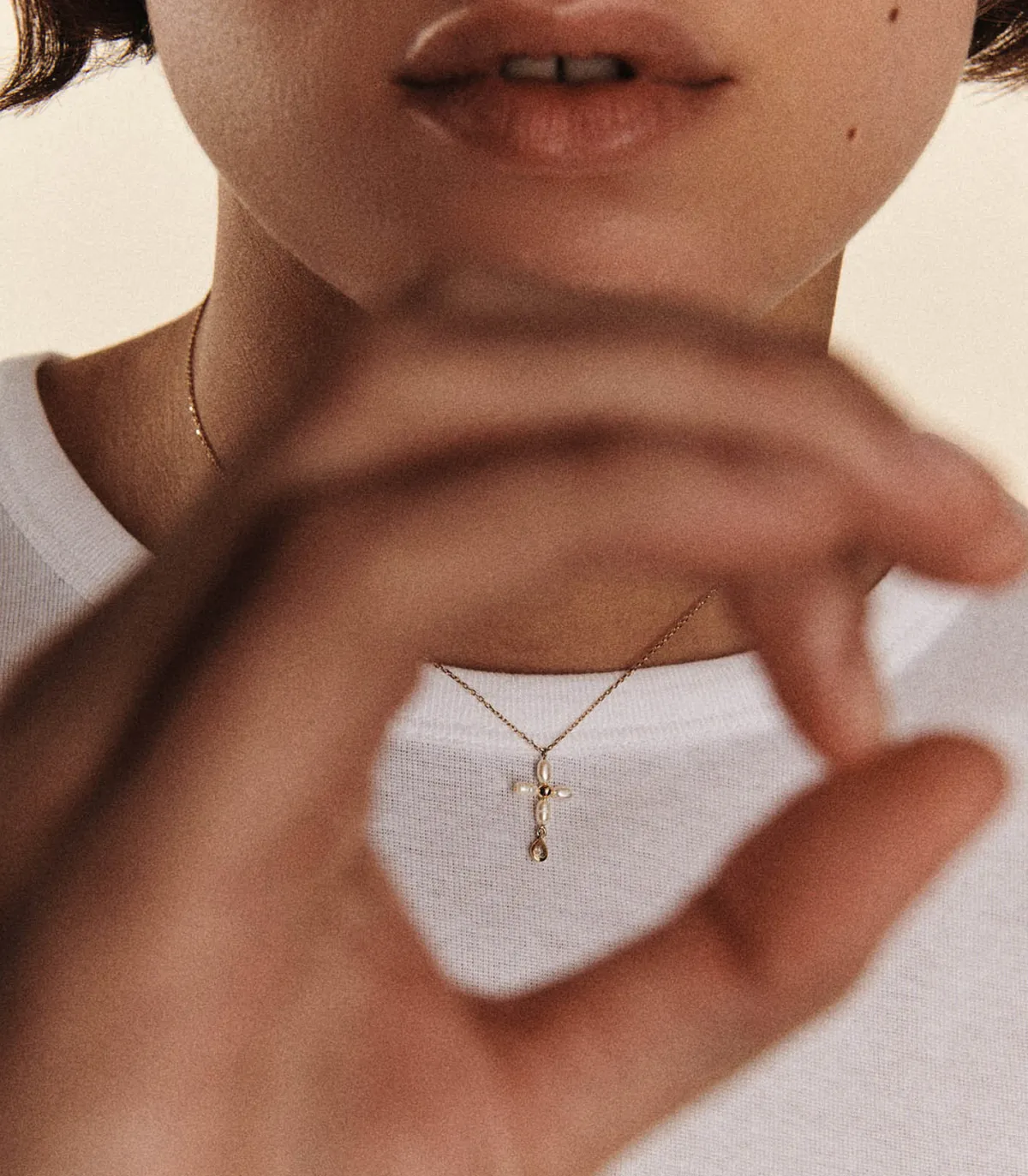 Collier Palerme White Pearl de la marque Pascale Monvoisin. Monté sur une chaîne en maille forçat en or jaune 9 carats.