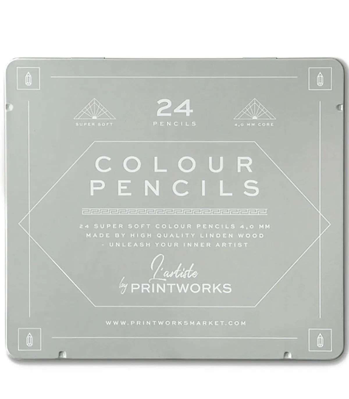 Les crayons sont présentés dans une boîte métallique au design sophistiqué.