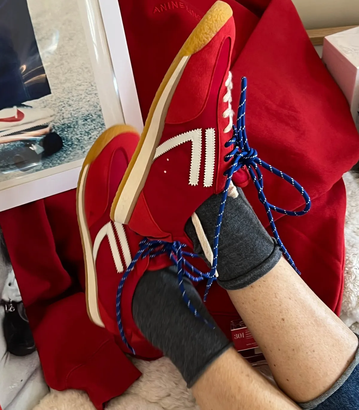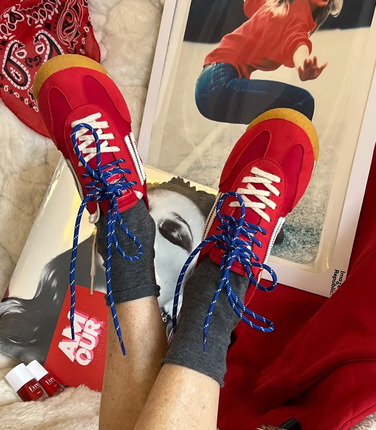 Le design est inspiré des années 80 avec une tige fine et souple, resserrée au niveau de la cheville. Lacets contrastants bleus et blancs dans un esprit sportif.