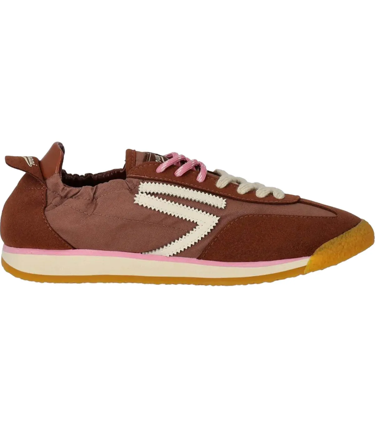Le design est inspiré des années 80 avec une tige fine et souple marron, resserrée au niveau de la cheville. Lacets roses et noir dans un esprit féminin.