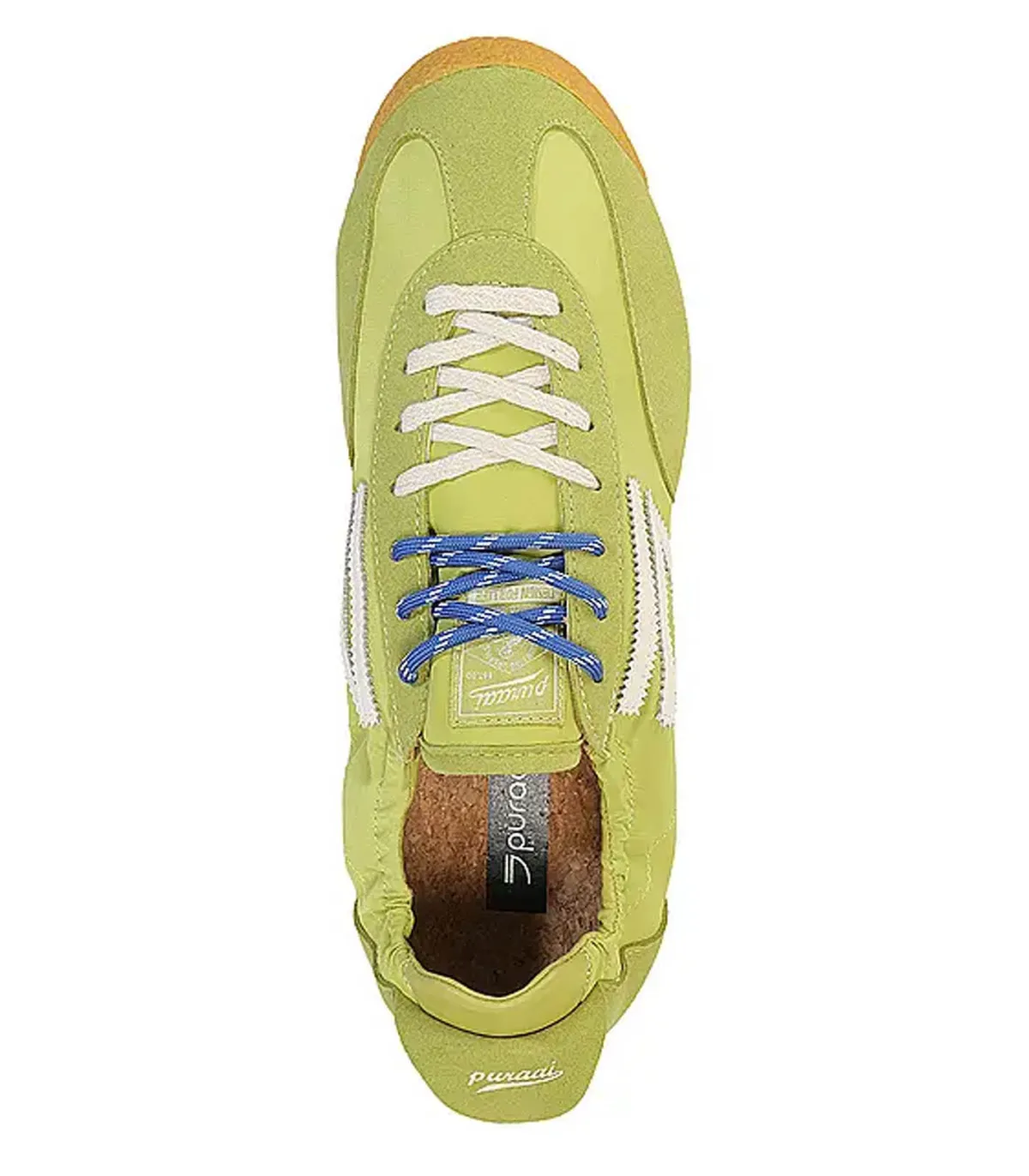 Le design est inspiré des années 80 avec une tige fine et souple vert citron, resserrée au niveau de la cheville. Lacets bleus et blancs dans un esprit sportif.