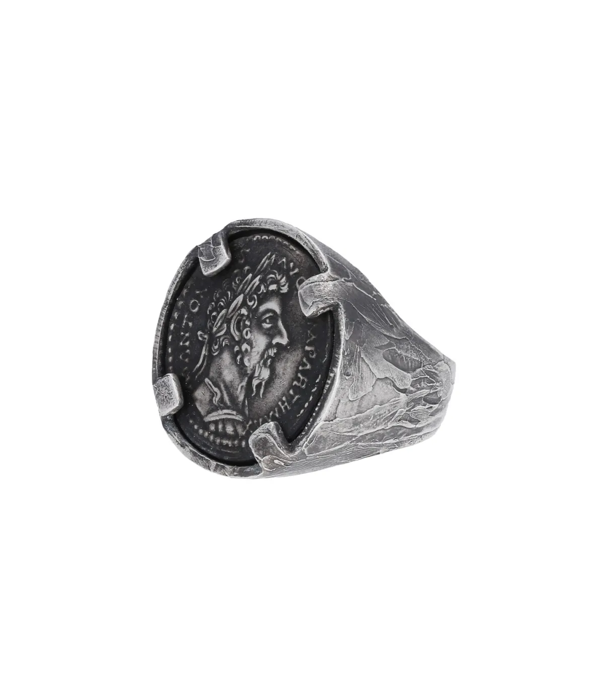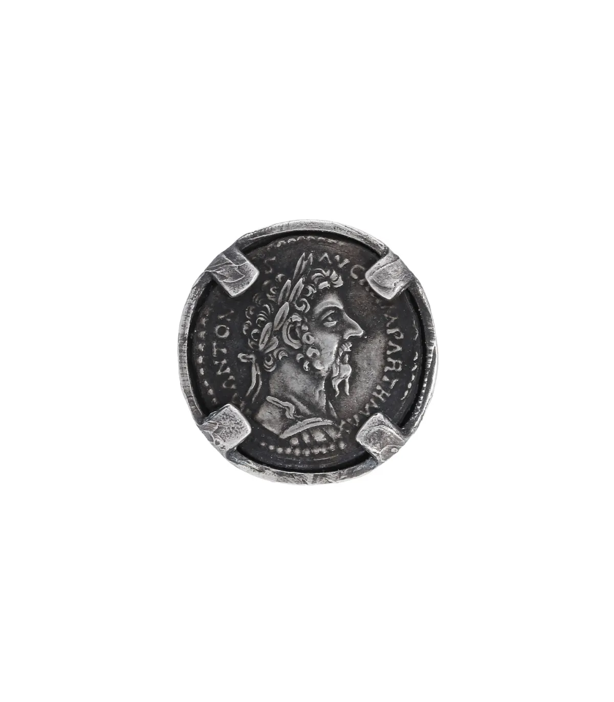 Bague chevalière « Le Pieux II » en argent Roc Paris. Cette bague présente une monture en argent 925 aux finitions irrégulières surmontée d’une pièce antique (reproduction). Sur le recto, gravure représentant le visage de l’empereur Antonin le Pieux.