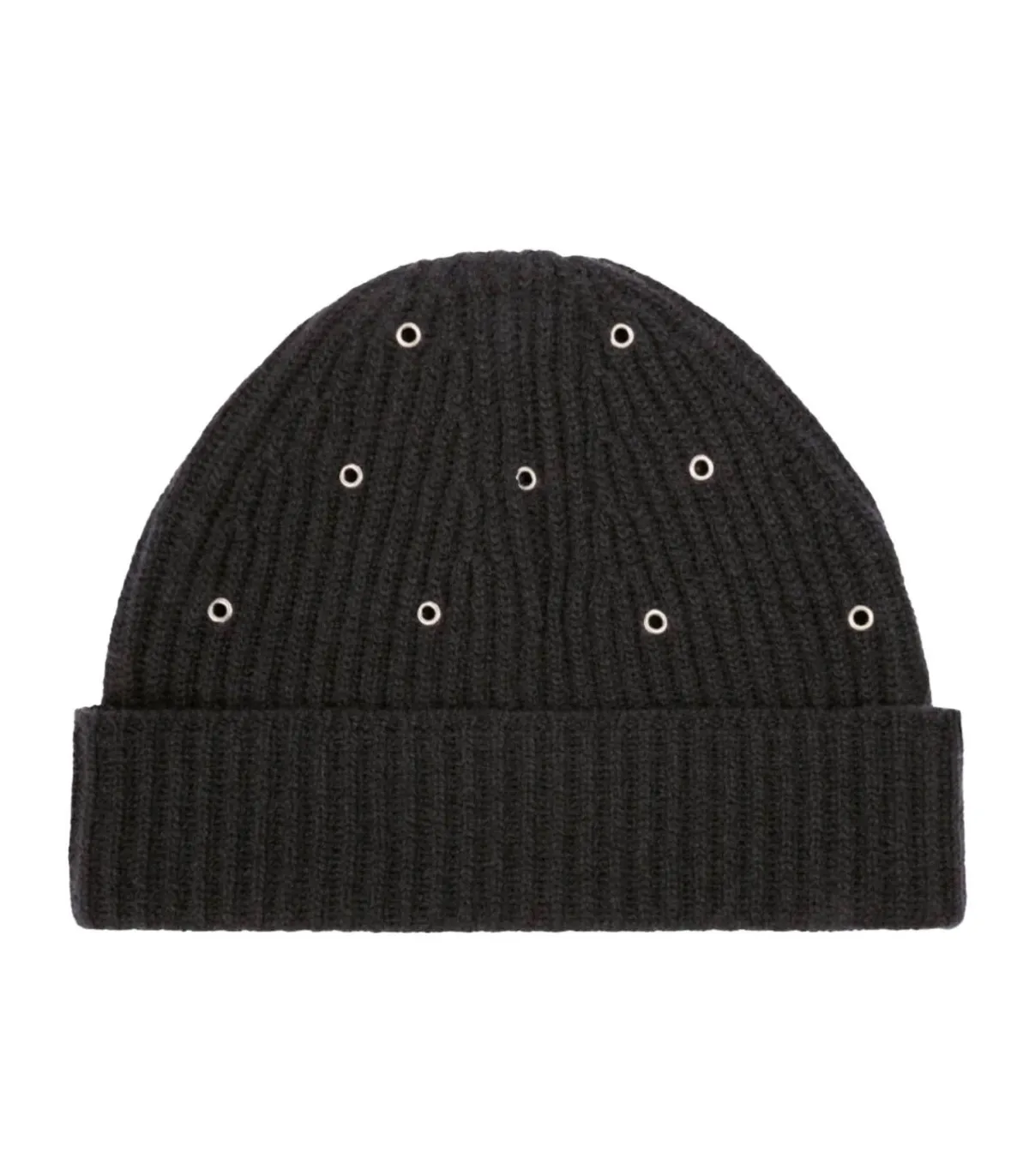 Bonnet Beanie de la marque Roseanna. Bonnet beanie en maille côtelée Navy, orné d’œillets métalliques posés à la main, apportant une touche délicate et originale. Le tricot « Ruffle » 3D, inspiré des volants, offre un volume sculpté sophistiqué. Confectionné à Madagascar dans une douce alliance de laine et cachemire, il promet chaleur et confort.