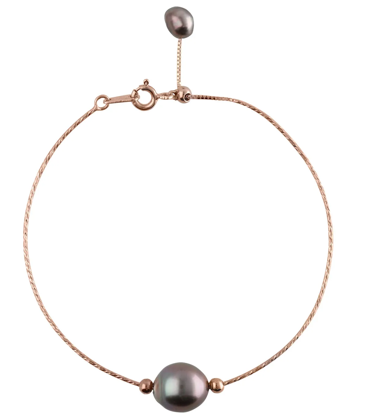 Bracelet Heimana rosé signé Tamahiné. Ce bracelet est composé d’un fil métalique rose fin et rigide, légèrement torsadé, agrémenté d’une perle d’eau douce en son centre.