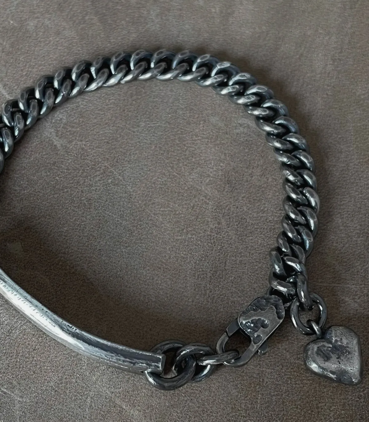 Bracelet If I Die de la marque Tó Garal. Dans l’esprit d’une gourmette, ce modèle se compose d’une chaîne et d’une plaque en argent 925 gravée de l’inscription « If I die please stay ».