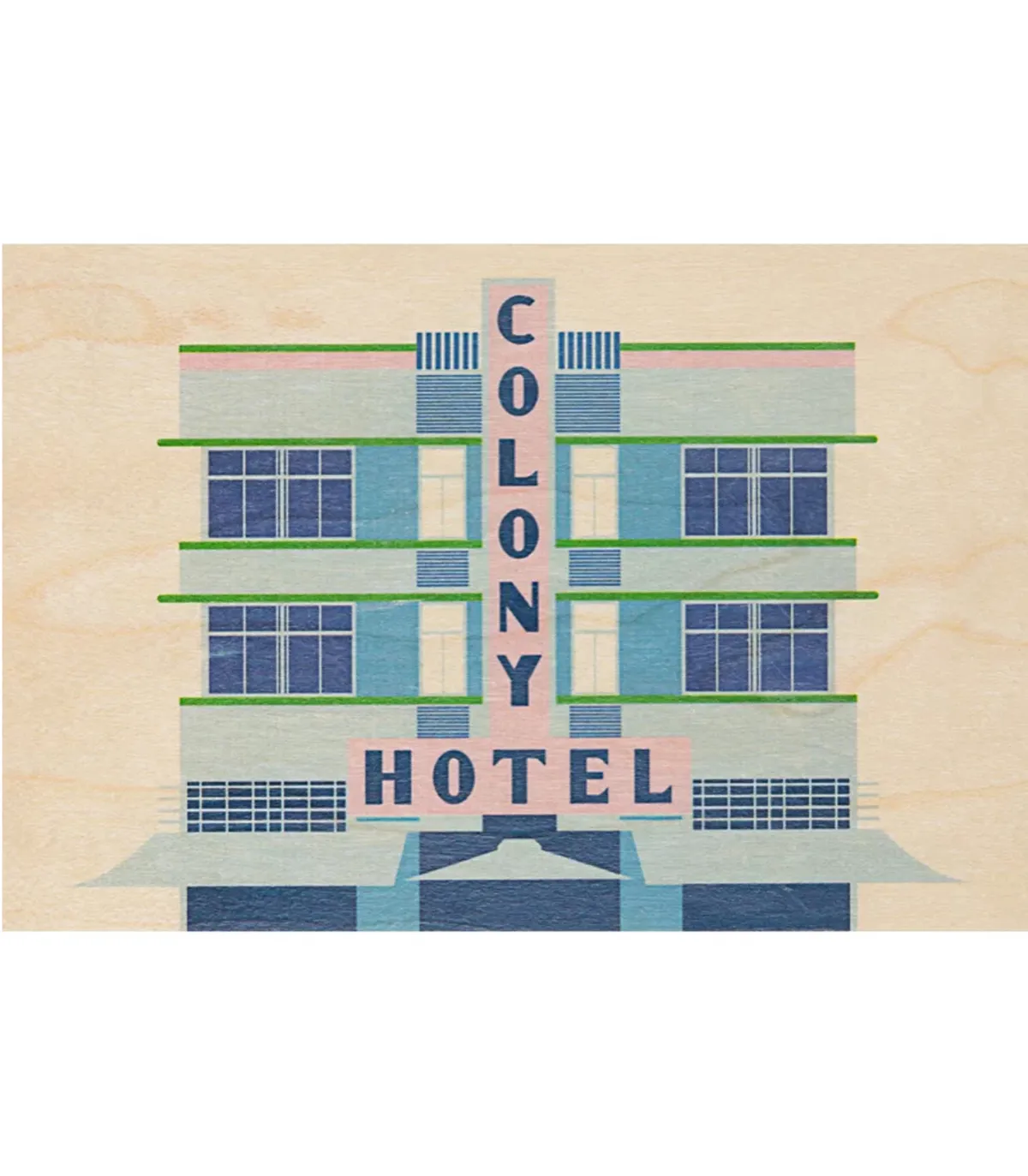C’est l’un des hotels les plus photographiés de South Beach à Miami : avec ses lignes Art Déco, le Colony Hotel est la star de la carte postale en bois Miami Colony Woodhi. Un objet déco aussi beau encadré qu’envoyé en souvenir de vacances, sur une base de bois massif.