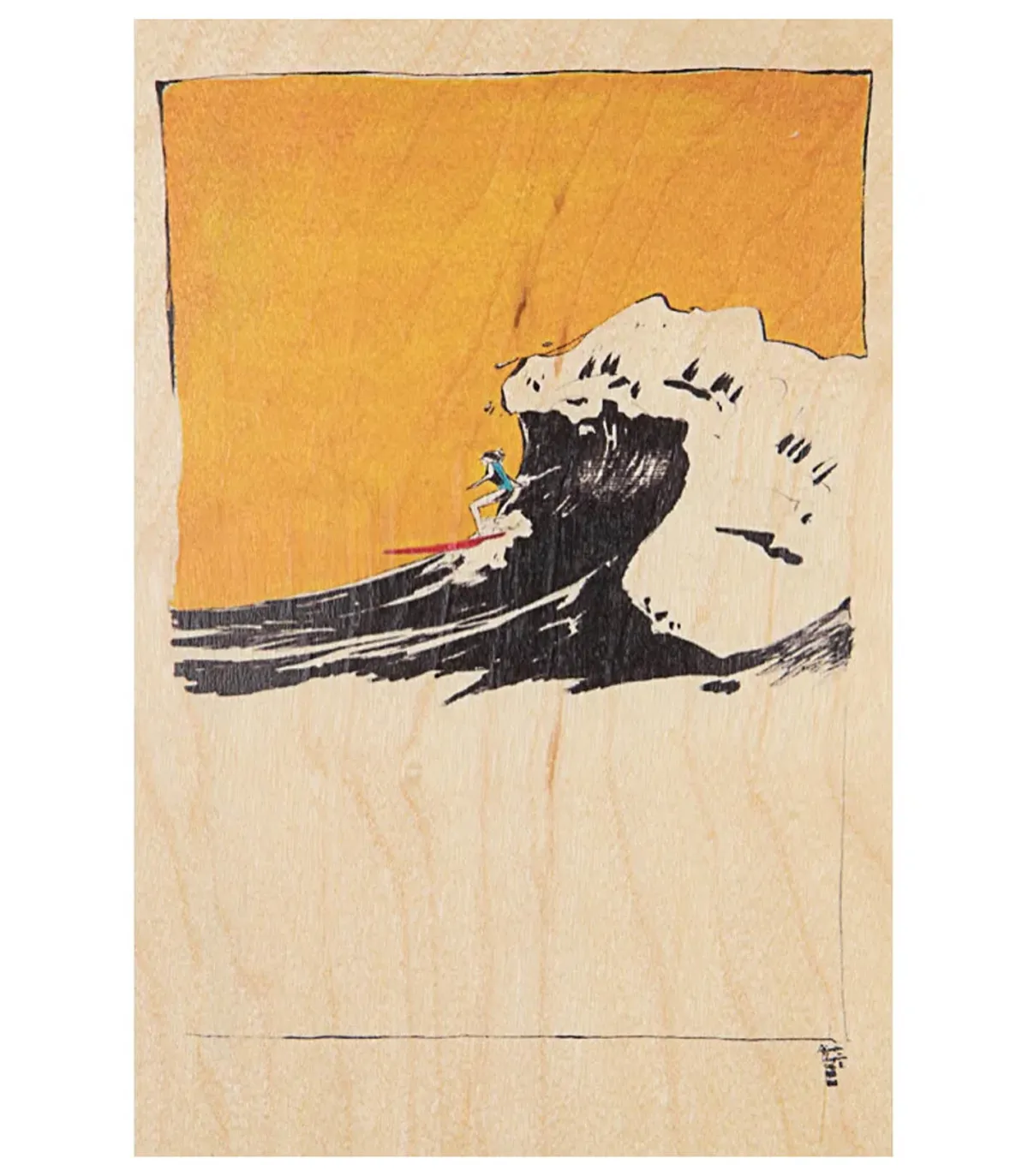 Carte postale en bois Ride Catch de la marque Woodhi, illsutré par Simon Charrière, passioné de surf et de vagues. Il réalise ici un dessin de vague surfée, devant un coucher de soleil donnant lieu à un ciel jaune. Une carte originale qui invite au voyage.
