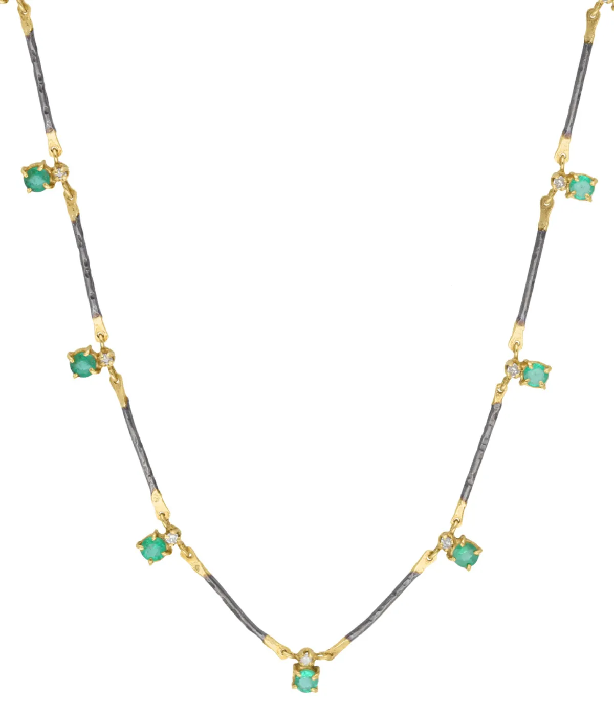 Collier Nora Emeraude signé 5 Octobre, une pièce fine à l’esprit sculptural avec ses baguettes assemblées et reliées par des pierres émeraude, chacune réhaussée d’un micro-diamant blanc. Conçu en or jaune 14 carats et argent noirci, il aborde une teinte bicolore unique.