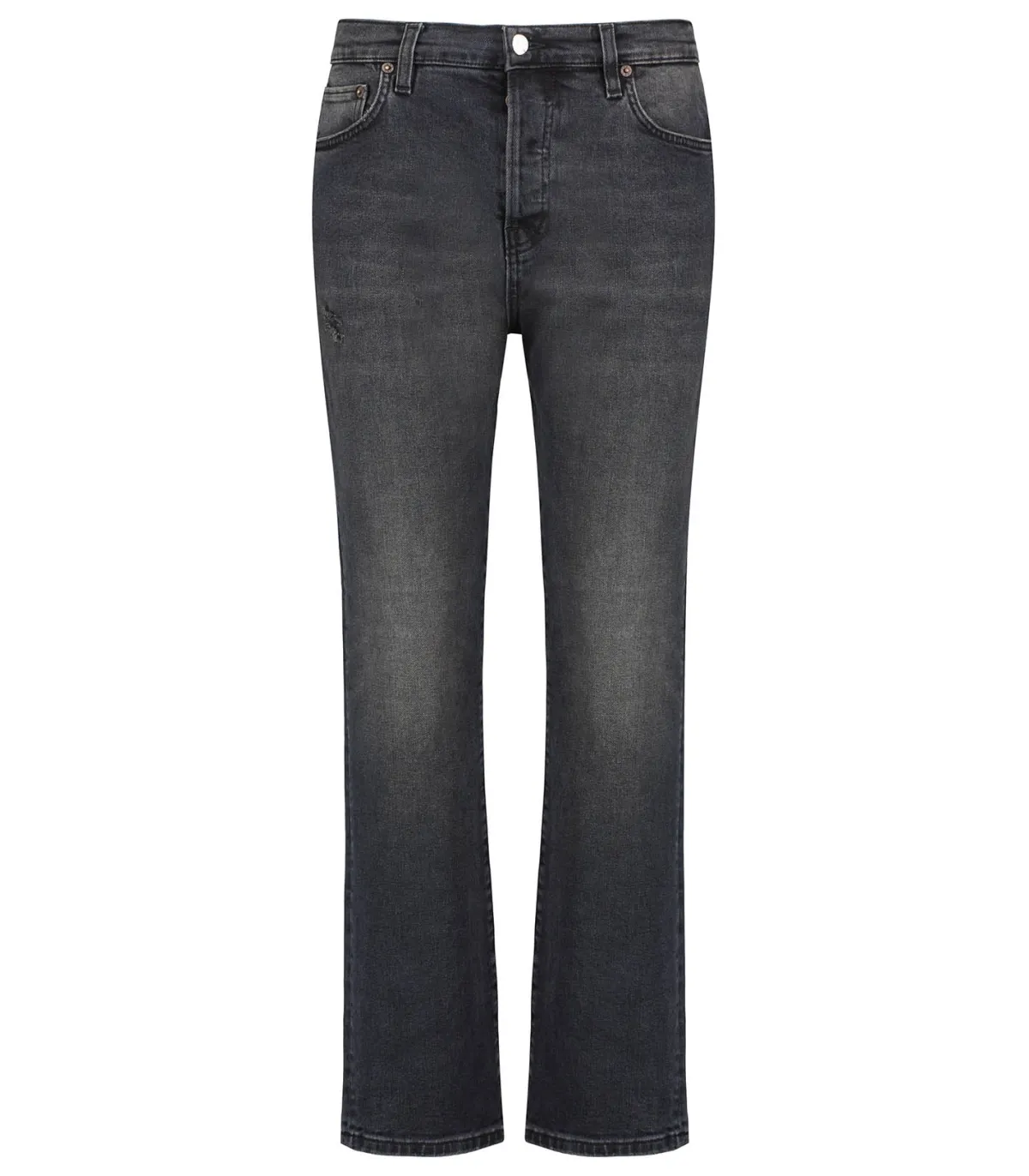 Jean droit 495 Black Brown de la marque 6397. Considéré comme un classique des collections de la maison, il présente une jambe droite légèrement raccourcie, ainsi qu’une taille haute. Teinte noire avec délavage prononcé aux cuisses, et légers détails déchirés.