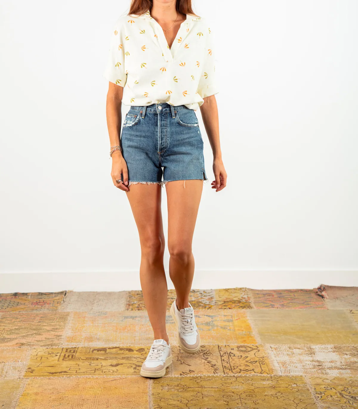 On l’associe à un tee-shirt blanc basic et des sandales à talons pour un côté plus sophistiqué.