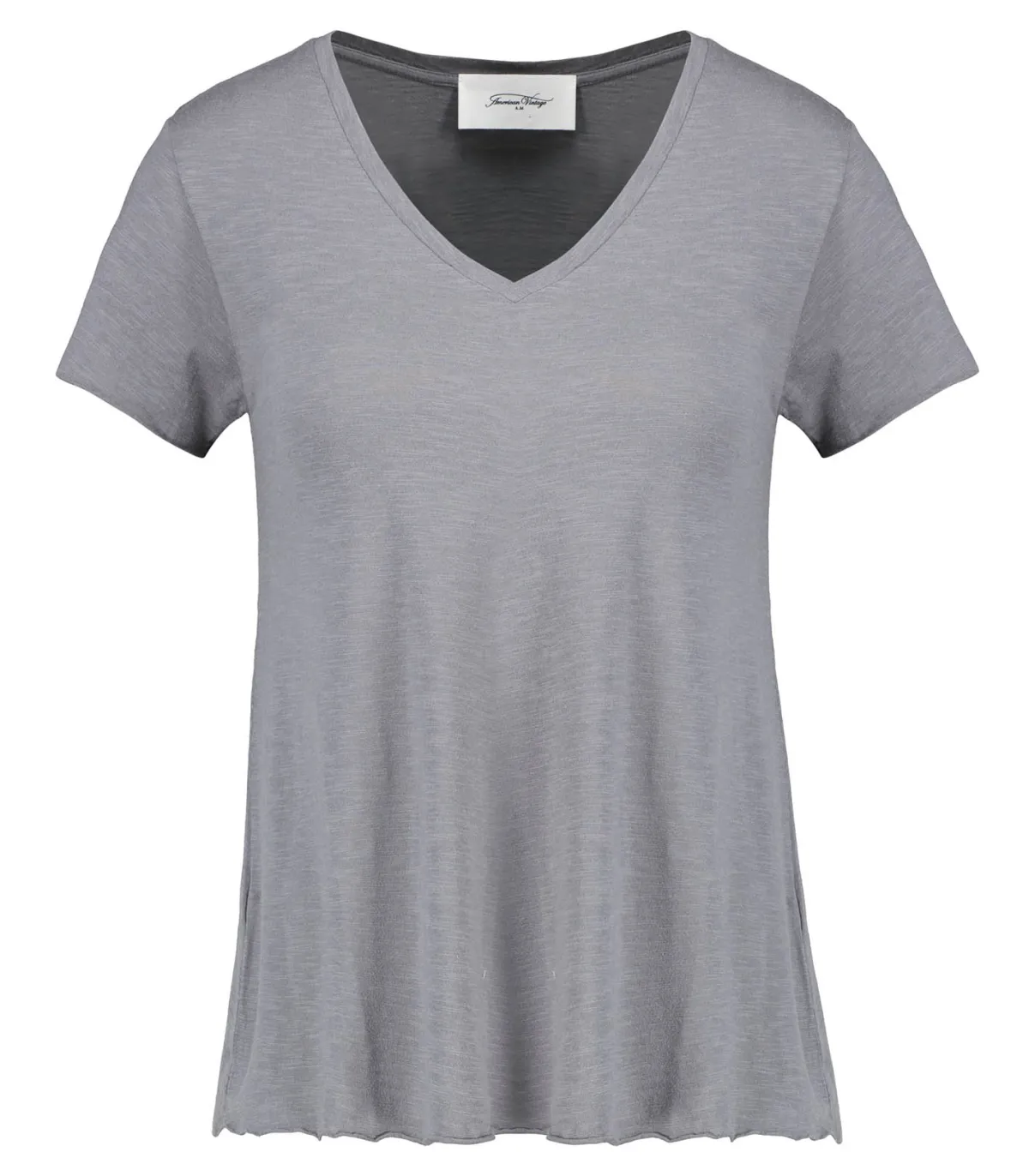Tee-shirt Jacksonville Metal Vintage de la marque American Vintage, une pièce à l’esprit vintage avec sa matière souple et son tissus délavé. Coloris Metal Vintage intemporel et original à la fois. Encolure en U casual et bords roulés qui donnent un côté décontracté.