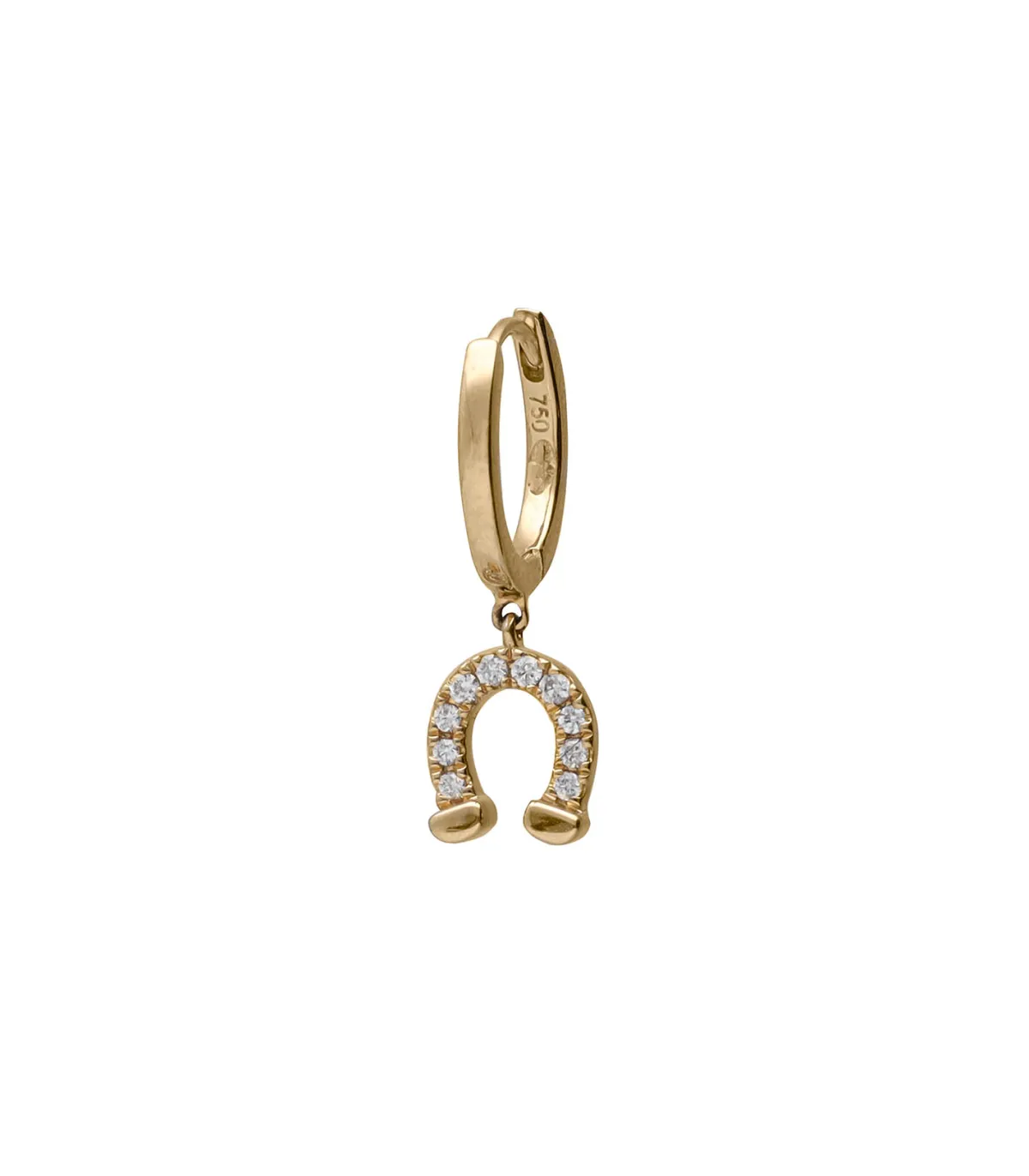 Boucle d’oreille créole or jaune et Fer à cheval en diamants signée And…Paris. Cette mini-créole en or jaune 750/1000 est un petit porte-bonheur, argémenté d’un fer à cheval en or et serti de diamants blancs.