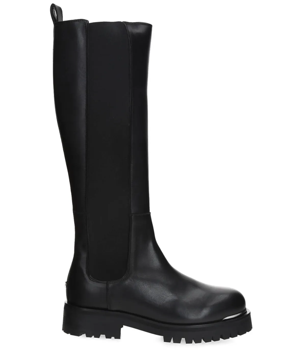 Bottes Noir Tall Justine de la marque Anine Bing. Une paire de bottes hautes en cuir, très tendance. Idéale pour allonger votre silhouette. Ce modèle est doté de détails argenté sur le bout de la chaussure.