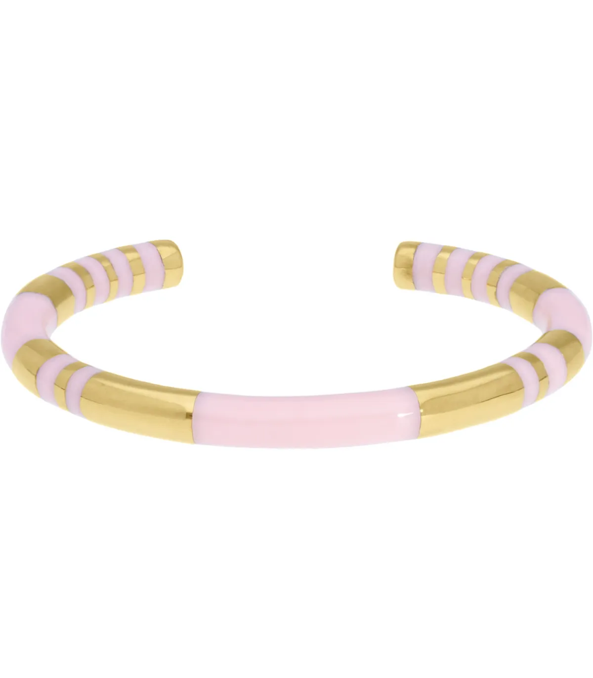 Jonc Actua Positano Baby Pink Aurélie Bidermann en résine rose et empiècements en or 750/1000. La collection Positano évoque les couleurs et la lumière de la côte amalfitaine pour des bijoux qui sentent bon l’été.