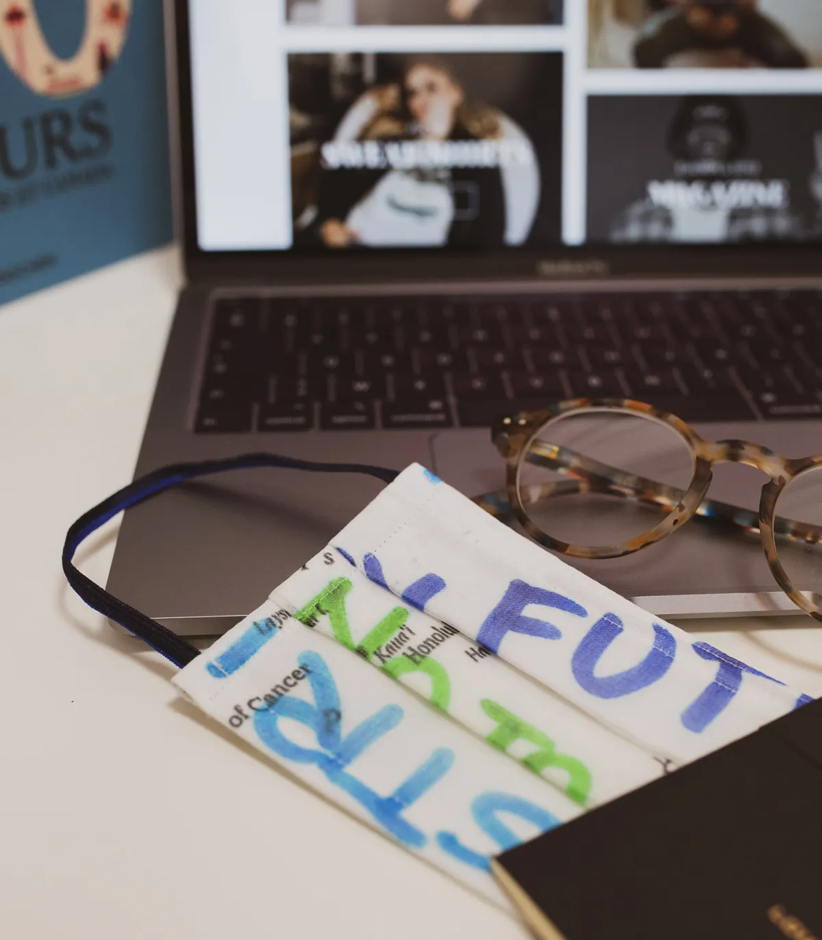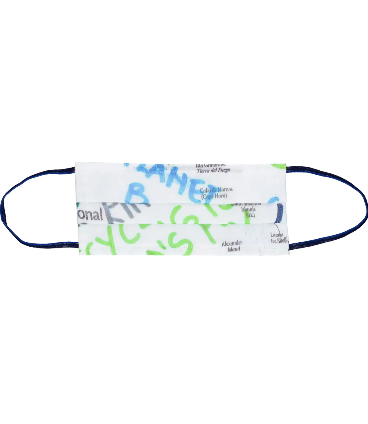 Bas les masques ! Accessoire indispensable dans le contexte actuel, le masque devient bien plus qu’un outil du quotidien, il se veut mode et distinctif. Optez pour ce masque Faliero Sarti réalisé à la main à partir de chutes de tissus utilisés pour la fabrication des fameuses étoles Faliero Sarti. Une toile en coton base blanc cassé sur laquelle on distingue des inscriptions de villes à la manière d’une carte géographique, accompagnées de wordings tels des graffs à la bombe dans des teintes vertes et bleues.