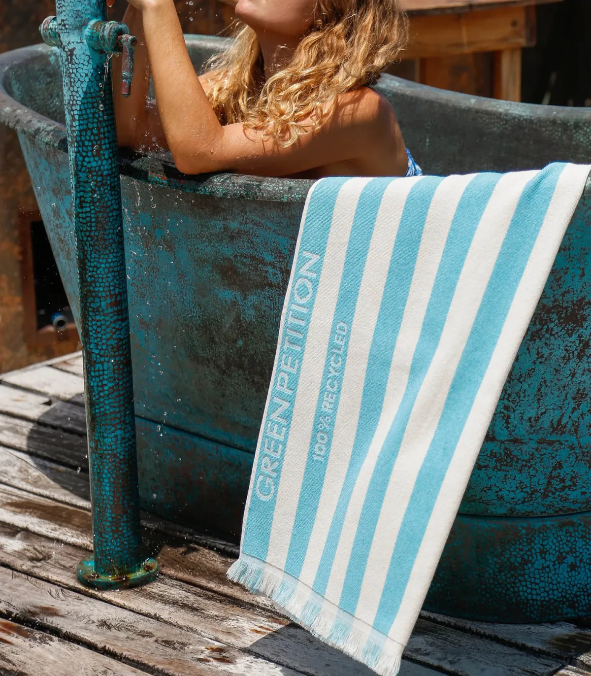 Cette serviette de bain est une option élégante et respectueuse de l’environnement. Elle est fabriquée à partir de matériaux 100 % recyclés, dont 50 % de coton recyclé, et est exempte de produits chimiques ou de colorants nocifs. C’est un choix idéal pour une expérience de plage chic et écologique.
