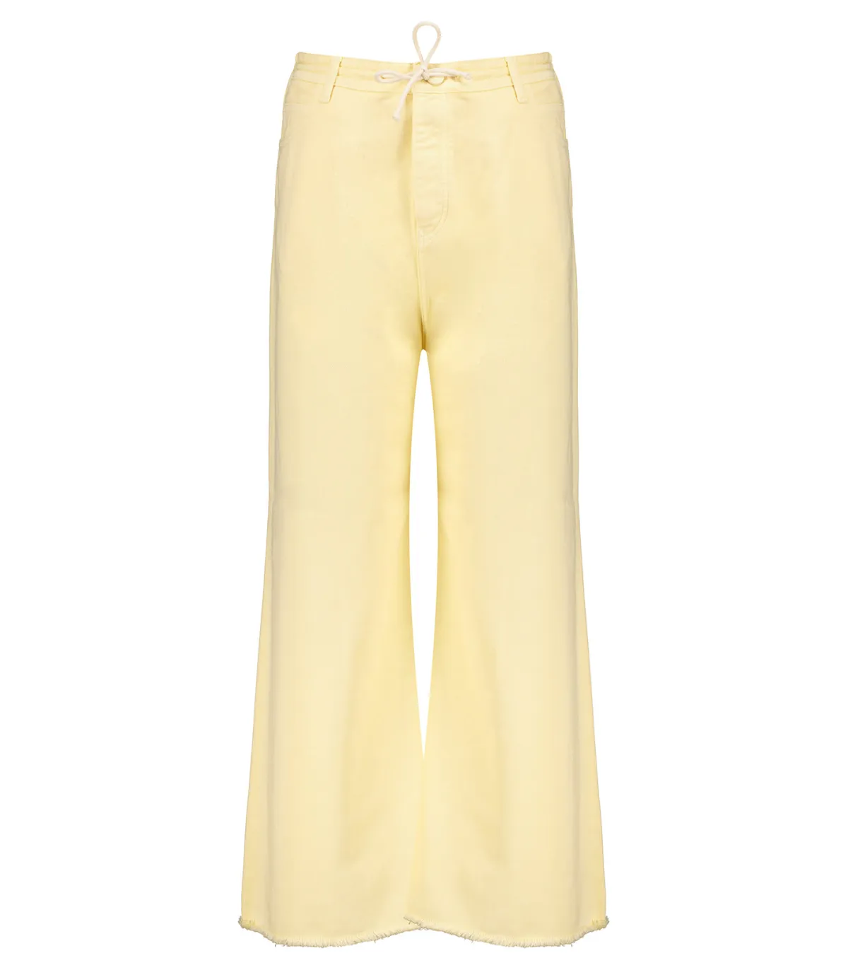 Jean Oversize en denim Jaune Pâle de la marque HAPPY HAUS. Le denim très fin et teinté d’un doux jaune pâle dans lequel ce modèle est conçu lui confère un aspect quasi-aérien.