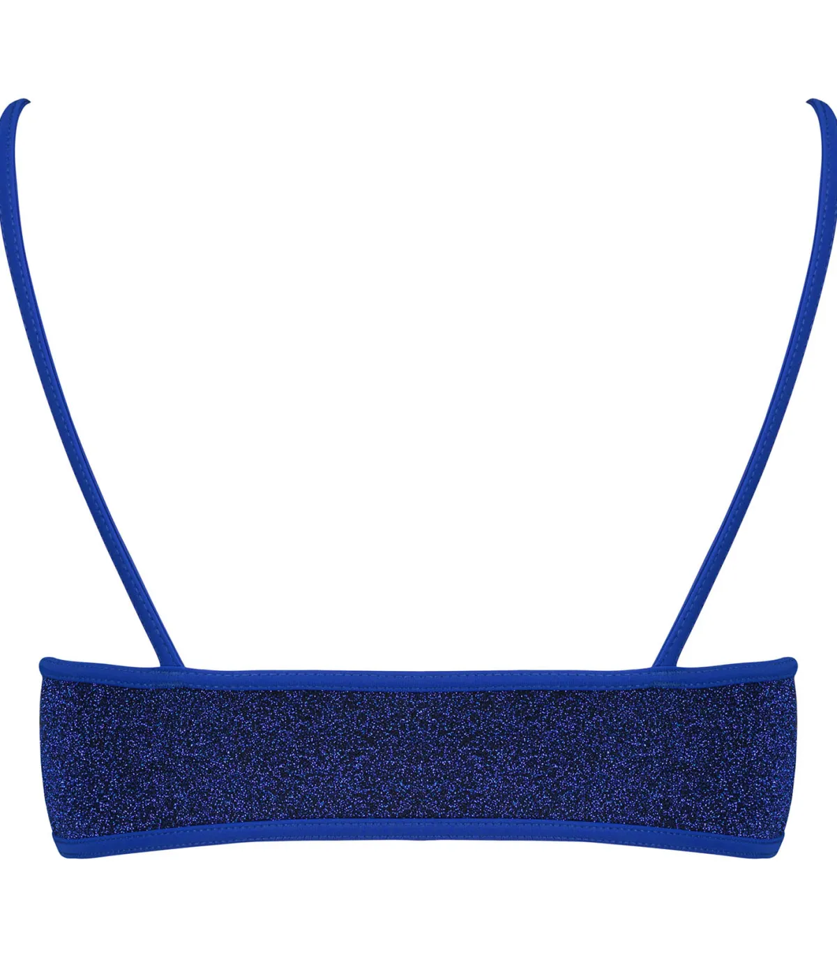 Haut de maillot de bain Georges Mousses Amovibles Deep Blue de la marque La Nouvelle, conçue dans un joli tissus lurex bleu nuit profond qui donne un côté sirène à la silhouette. Sa forme en V et ses fronces au centre de la poitrine permettent de la mettre en valeur. Mousses internes amovibles.