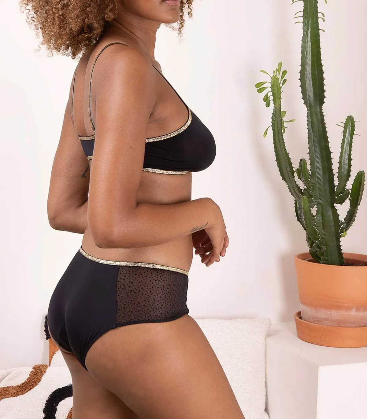 Shorty Menstruel Moon flux abondant Plumetis signé La Nouvelle. Optez pour cette culotte menstruelle qui allie confort, fonctionnalité et esthétisme. Rien de mieux pour se sentir fémimine et protégée tout au long de la journée. Ce shorty vous facilitera vos périodes menstruelles à l’aide de ses doublures absorbantes, aussi efficace que 3-4 tampons normaux. Fabriqué en fibres de bambou et en coton, il garantit un confort optimal pendant cette période.