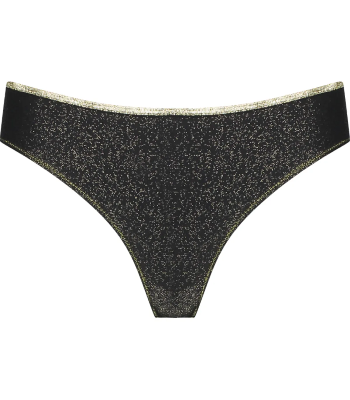 La gamme intemporelle des collections La Nouvelle Lingerie se dessine autour de coupes simples pour le quotidien et de matières à la fois féminines et intemporelles. Découvrez le Tanga Inès dans un joli coloris noir lurex, parfait pour une lingerie glamour.