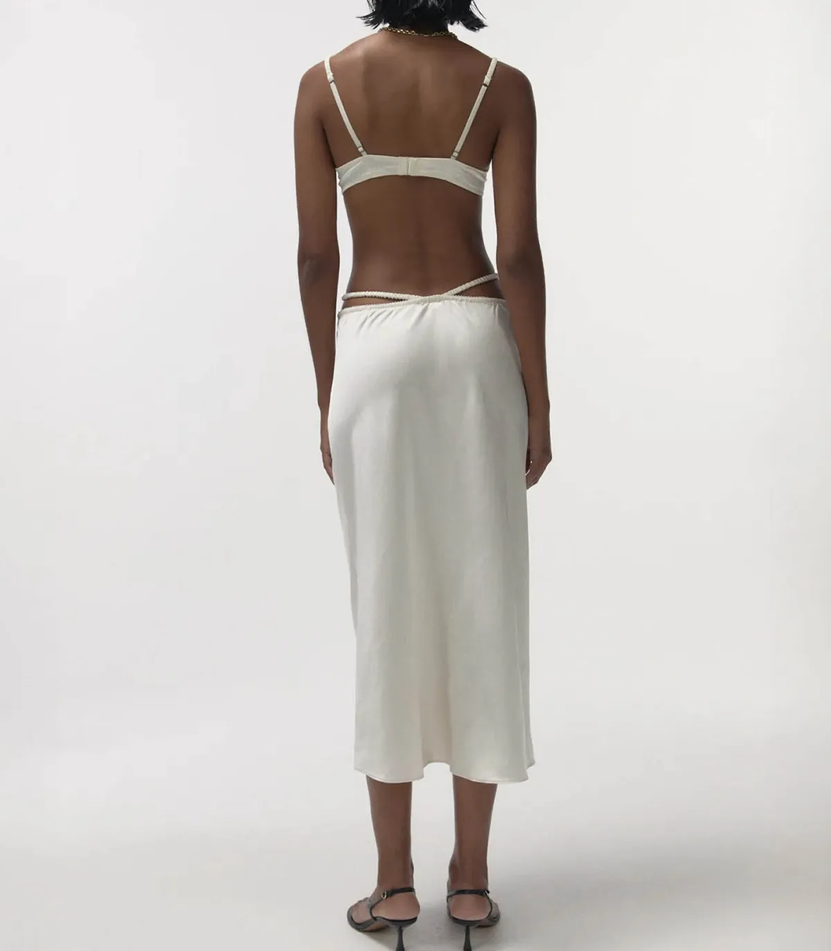 Jupe Mia Off White de la marque Love Stories. Cette jupe blanche à la taille haute incarne l’élégance moderne avec son tissu satiné qui capte la lumière. Son design audacieux se distingue par des lanières inspirées du style string, créant un effet superposé fascinant. Les lanières sont délicatement recouvertes de tissu froncé, ajoutant une touche de fluidité et de féminité. Parfaite pour les occasions décontractées ou formelles.