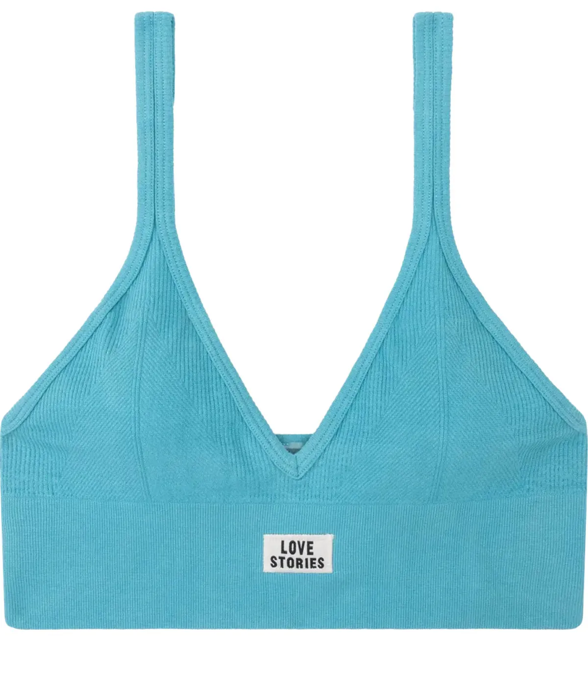 Soutien-gorge Posey Blue de la marque Love Stories. Alliant simplicité et confort, la bralette triangulaire Posey en bleu ciel est une pièce essentielle du quotidien. Non rembourrée, elle offre un soutien moyen tout en assurant un ajustement naturel et sécurisé.