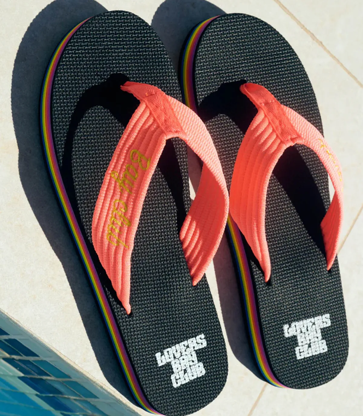 Tongs Corail de la marque Lovers Bay Club. Cette paire de tongs noires avec des bandes de couleur corail offre un mariage élégant entre sobriété et éclat estival. Les tongs noires apportent une base classique et polyvalente, tandis que les bandes corail ajoutent une touche de couleur vive et ensoleillée. Que ce soit pour une journée à la plage ou pour une promenade en ville, ces tongs apporteront une touche de fraîcheur et de dynamisme à votre tenue estivale.